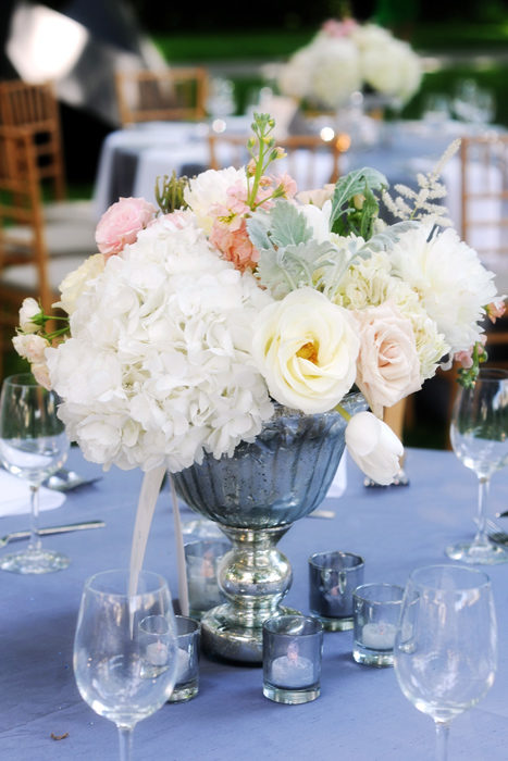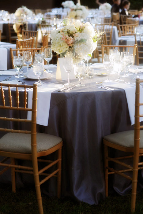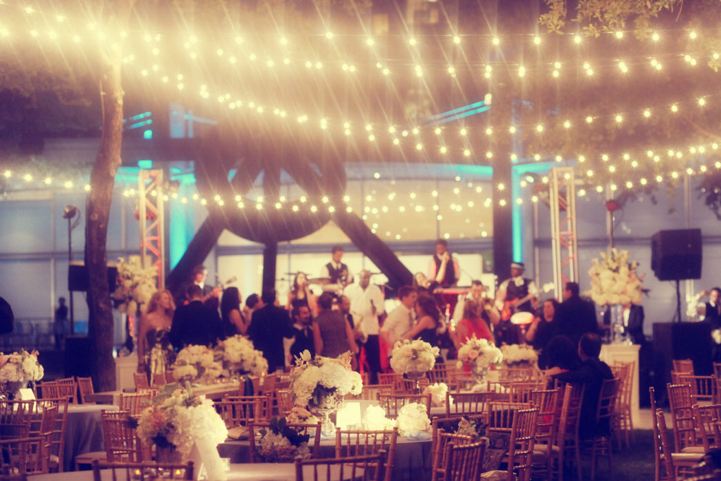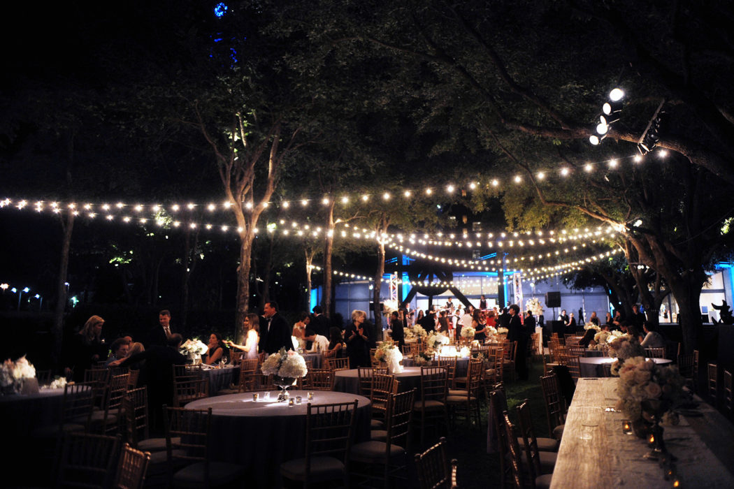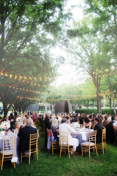 Emily draped the ground level of the soaring rotunda in white and accented the space with pink and white flowers. “Bright but soft” is how the bride describes it. In the garden at the Nasher, white lights were strung tree to tree. Two long farm tables and many round tables were set with silver and crystal, candles in glass containers, and bouquets of pink and white flowers in a variety of silver vases. Amid the glow of downtown and the priceless art collection, guests had dinner and a fun evening of dancing to mark the start of a new marriage.