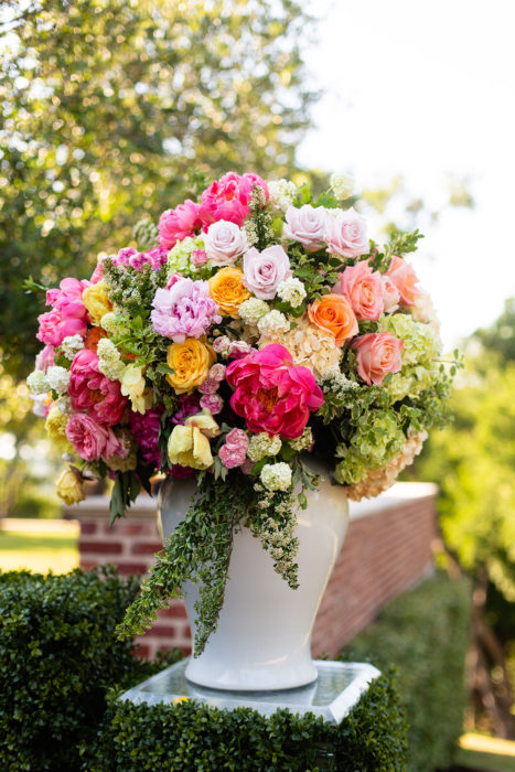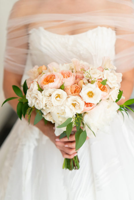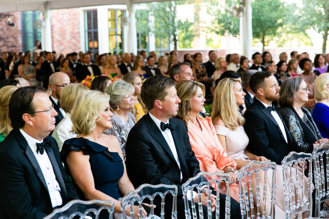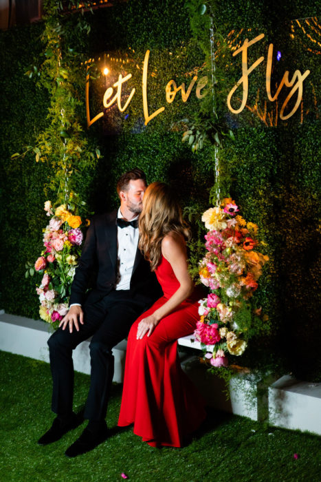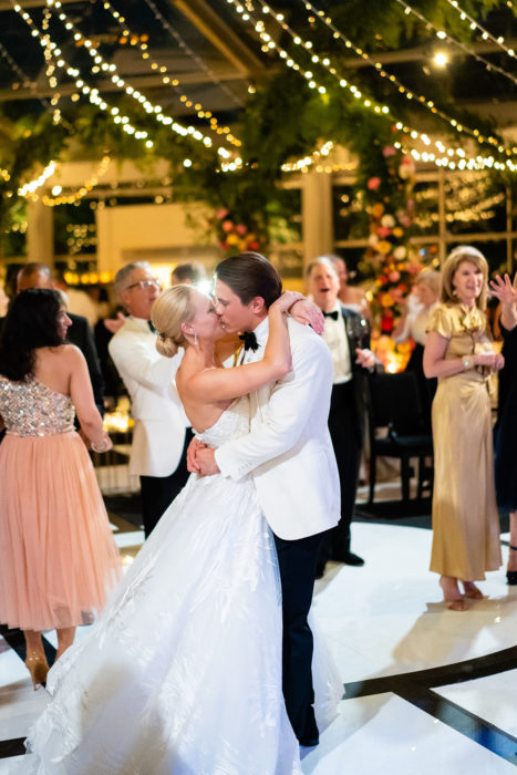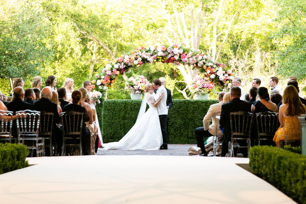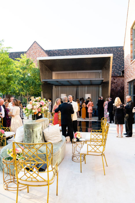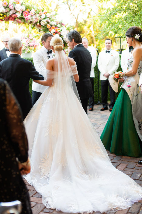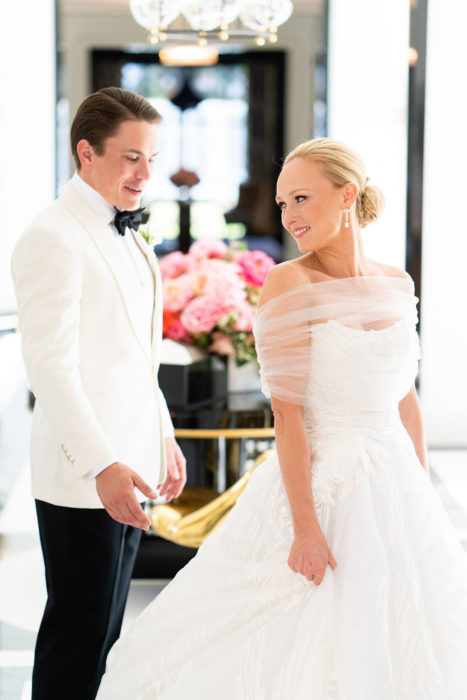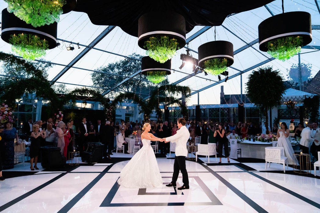 Fort Worth native Christopher Goff played tourist on his first date with resident New Yorker Averi Barron: lunch in Times Square followed by ice skating at Rockefeller Center. “It was so sweet, but not something that someone who grew up in Manhattan would ever have thought to do on a first date,” she says. The couple met through friends and continued to date while living in the city, even getting engaged at French restaurant Daniel in the Upper East Side. But for their wedding day, they planned a garden-inspired affair at the Goff ’s family home in Fort Worth. They danced and dined on June 8, 2019, atop a black-and-white checkered dance floor that mirrored the home’s marble flooring. “Christopher and I wanted our wedding to feel intimate and be a true representation of us as a couple and our families,” she says. “Having our ceremony and reception at the Goff residence was the only place we ever considered.”