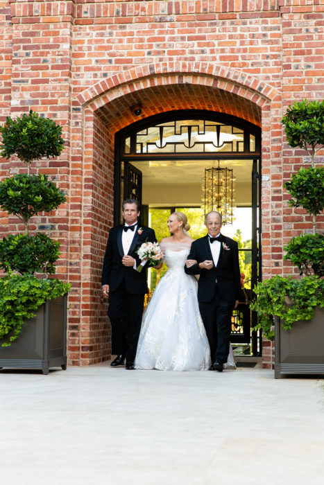 When the couple tasked Todd Events with the mission to turn the Goff residence into a wedding venue, they had but one request—make the reception feel like an extension of the home. The 1926-era residence had all of the architectural characteristics of an English manor, so Todd and crew came up with the idea to fashion the tent after the citrus tree greenhouses that were common in homes in the late 18th and 19th centuries. “We wanted the tent to feel like a beautiful orangery on the property,” Averi says. “We really wanted to let the natural and existing beauty of the house and property to shine throughout.”