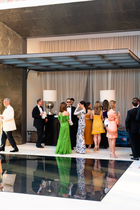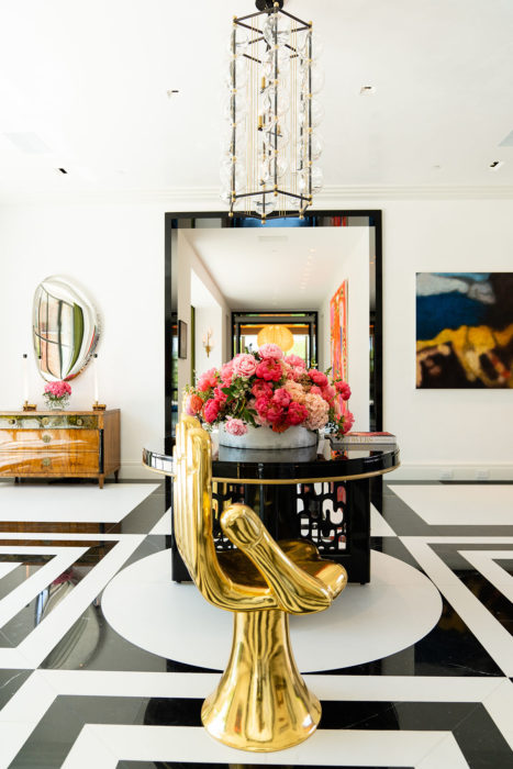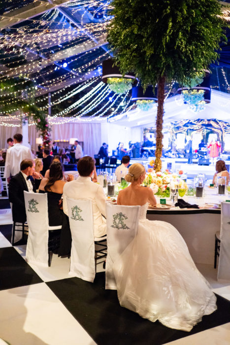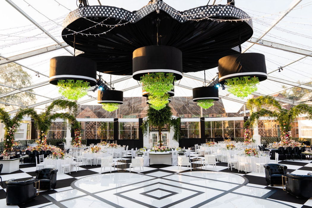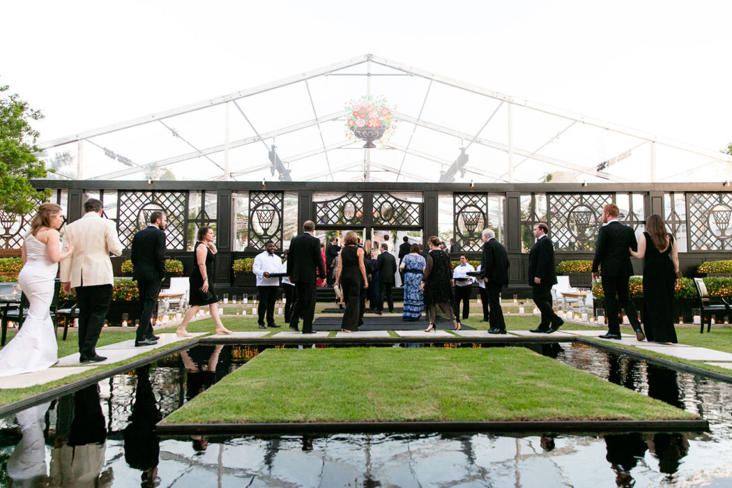 “Todd is so creative and was able to bring in elements of the home when creating our reception space,” says Averi. Guests could see down the gallery’s black-and-white Italian tiles all the way to the reception tent where the floors matched.
