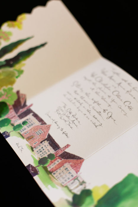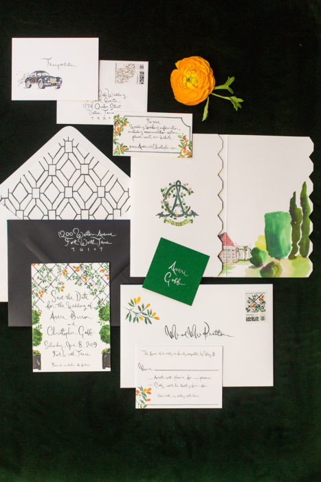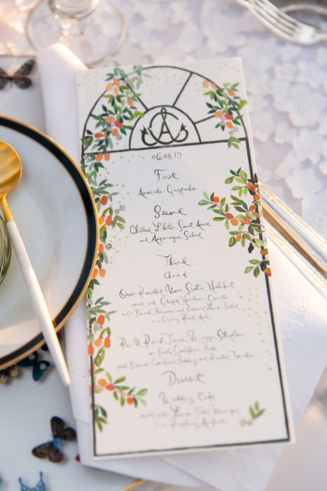 Happy Menocal designed the invites and crest, which were inspired by the natural beauty of the property and the house. “We loved the idea of using citrus fruits to introduce—or tease—our guests to the decor starting with the invitation,” Averi says.