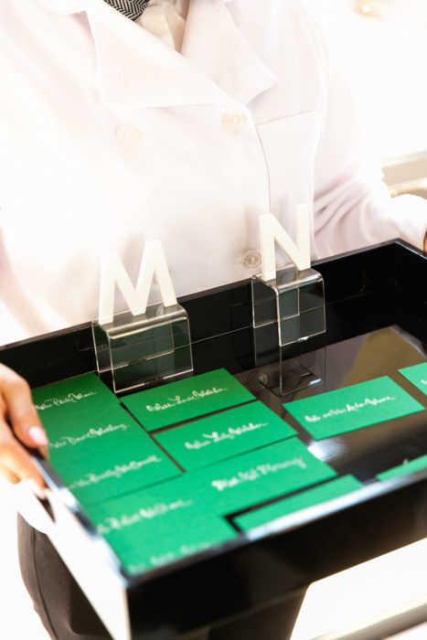 Todd Fiscus came up with the idea to present the escort cards on beautifully decorated trays.