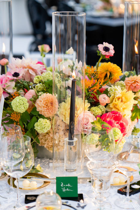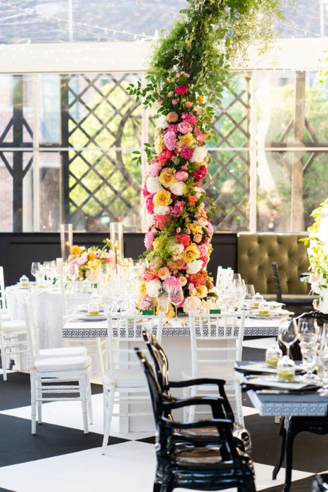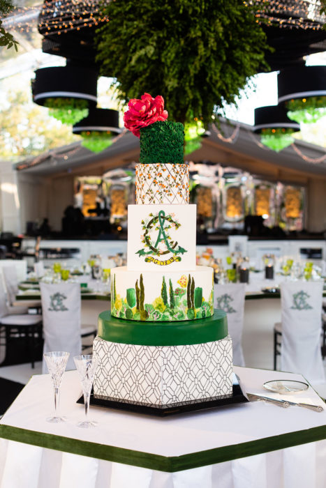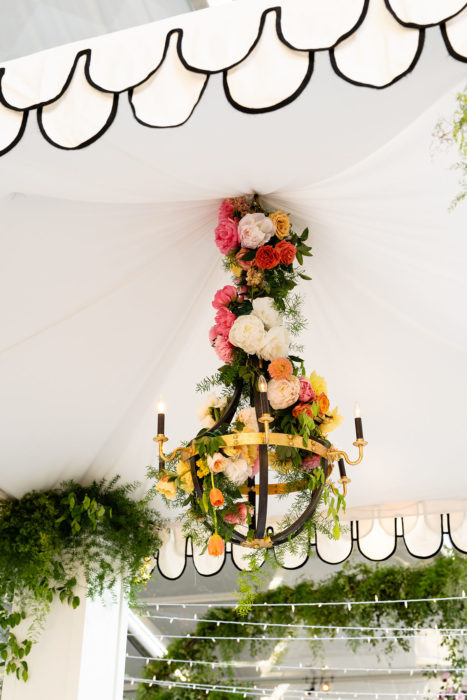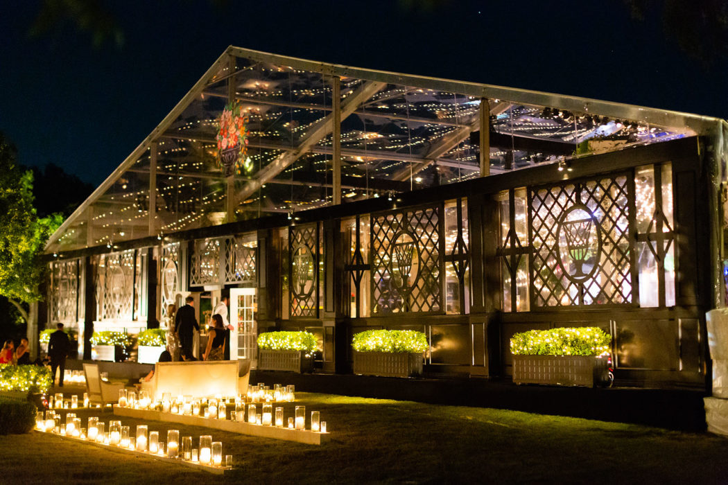 Todd and team designed the tent to look like an orangery, a greenhouse circa the early 1900s that stored citrus trees in the winter. Black-painted trellis details added to the charm and the garden vibe.