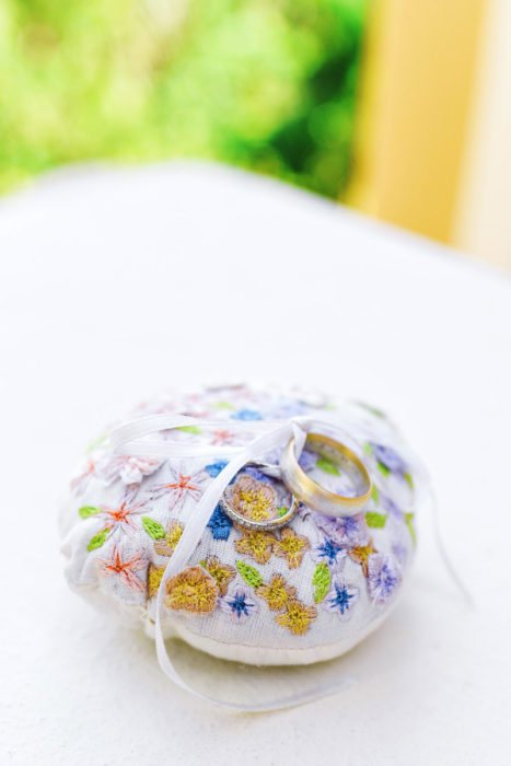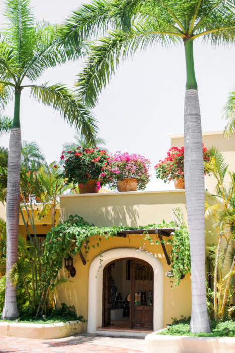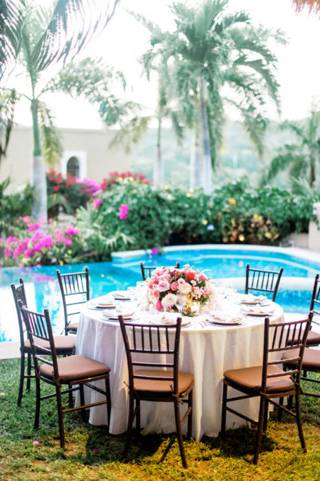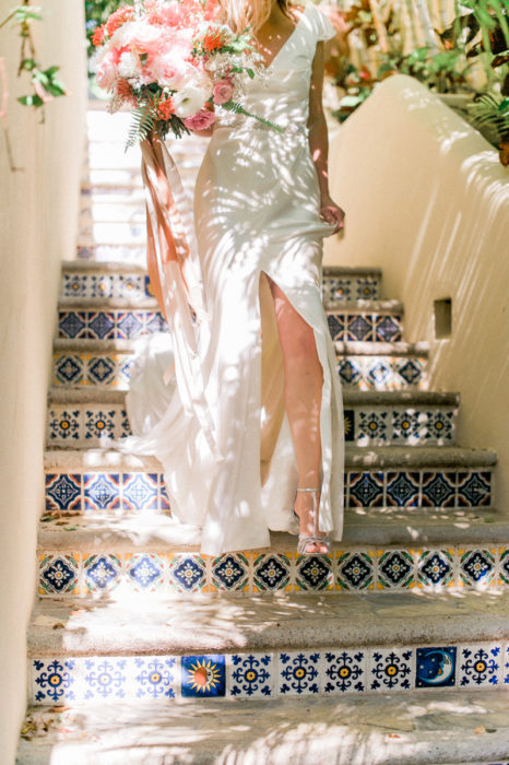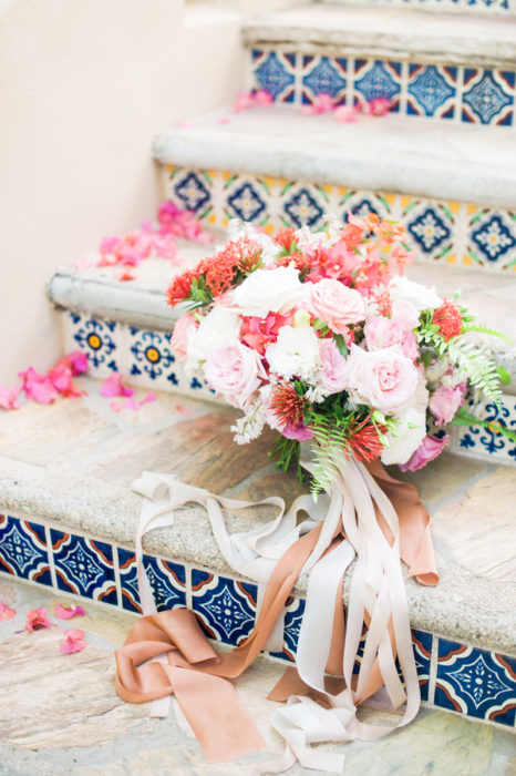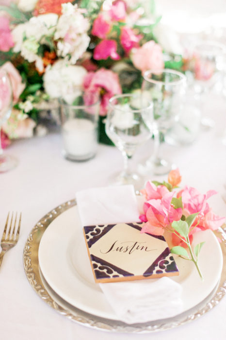 After a cocktail party complete with a mariachi band, guests were led to the reception set amongst organic-style arrangements of garden roses, ranunculus, native greens, and lisianthus in tones of coral and pink. The couple called on GRO Floral & Event Design to execute their wedding details, from the floral arch at the ceremony to the handpainted tile place cards.