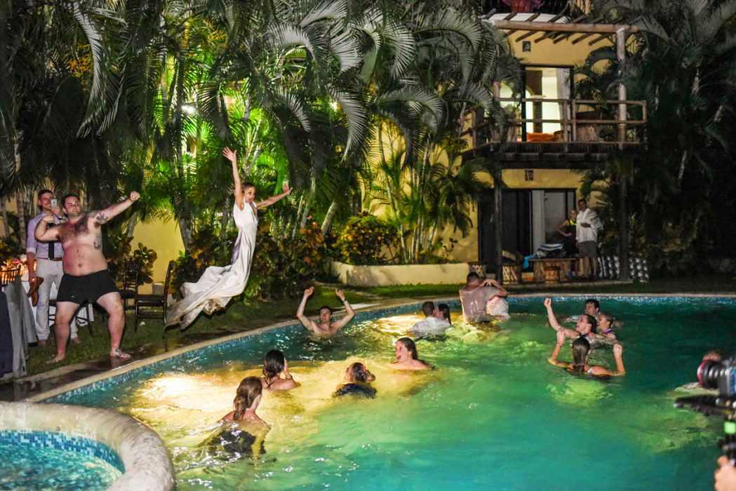 At the reception, Avery hired fire dancers as a gift for Kyle, but he had another surprise up his sleeve. At the end of the night, Kyle grabbed the microphone and ordered everyone to jump in the pool. And they did—even Avery in her Johanna Johnson silk wedding dress. As Kyle sums it up, “This was the craziest night of our life—this was the best night.”