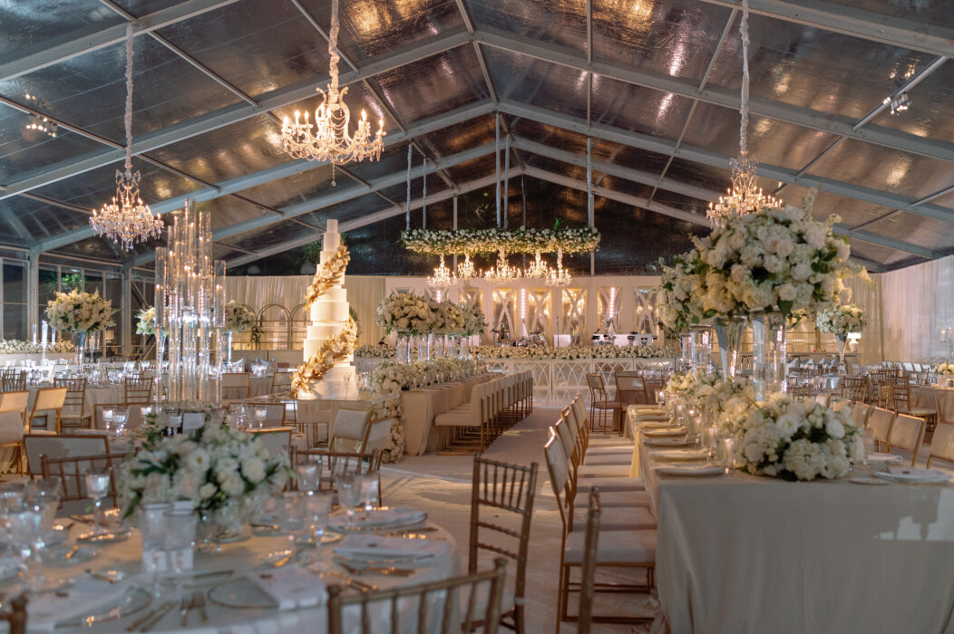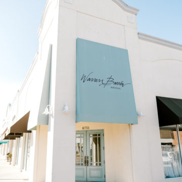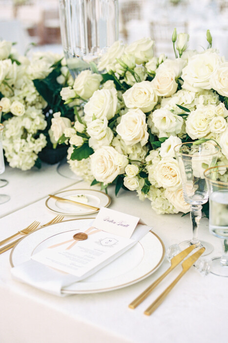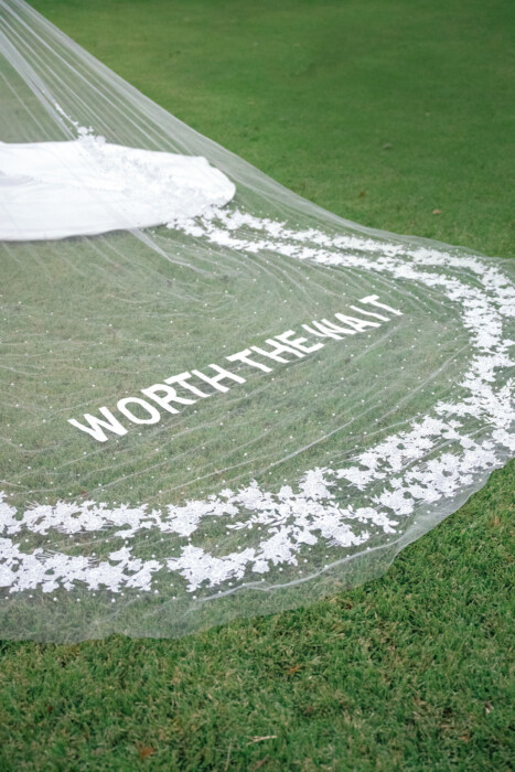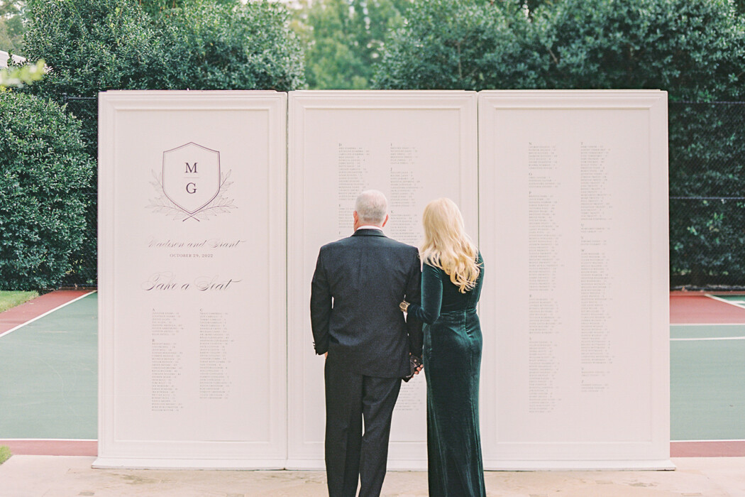 Due to just a 12-week engagement, RSVPs were coming in right up until the wedding day. With that in mind, stationer Erin Wright of Sincerely, Addison created vinyl sheets of the guests’ names and seating assignments, which were displayed on walls from Perch Event Decor.