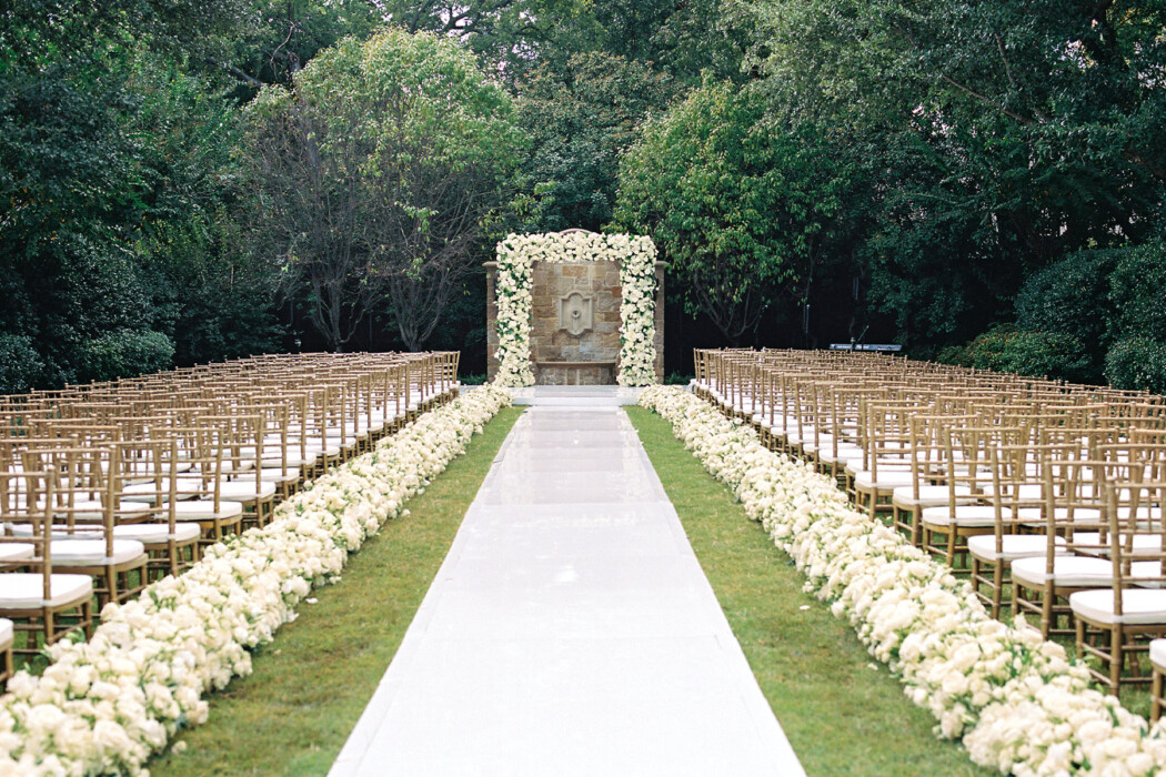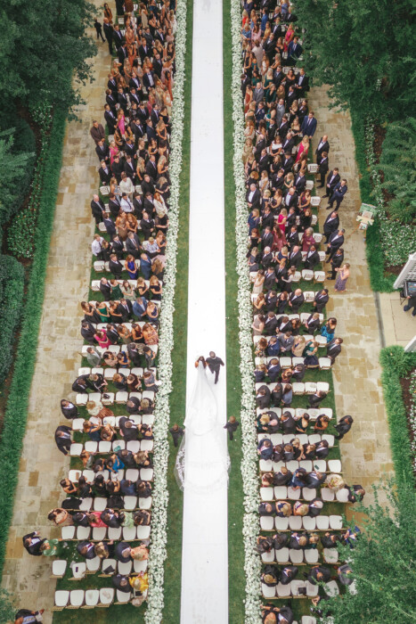 Planner Whitney Bailey worked with the bride, dress designer Nardos Imam of Nardos Design, and florist Taylor Davis of Something Pretty Floral to create a 100-foot, flower-lined aisle that was both wide and long enough to allow the veil to be seen by guests.