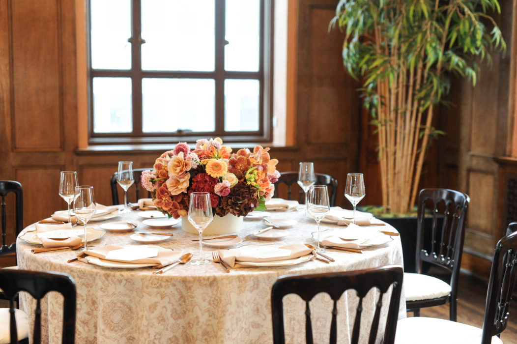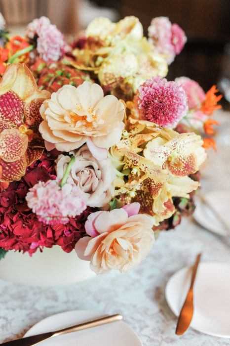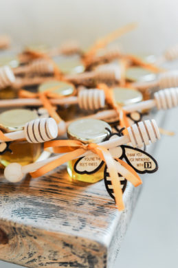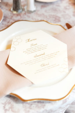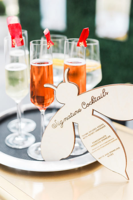 “Given the nature of my job, I am a complete sucker for a good theme. While brainstorming with the D Weddings team, I kept coming back to honey bees. The soft gold tones, complimented by the iconic red D would make for a great color palette against the rich wooden textures that the courtroom at 400 North Ervay has to offer. I wanted it to be soft and beautiful but also fun! The invitation and menu cards had soft gold foil accents of honeycomb and cute sayings like ‘Honey, D Loves You’ to make sure our guests knew they really were appreciated for all they do for the industry and Dallas brides. We continued the theme through ‘buzzworthy’ foods that featured honey elements such as the thyme-infused vodka with honey lemonade and warm cream biscuits with whipped honey butter. The soft pink linens added an extra element of Southern flair with assorted chargers and service plates. My favorite element were the wooden laser cut bee bar menus and our honey favors!”