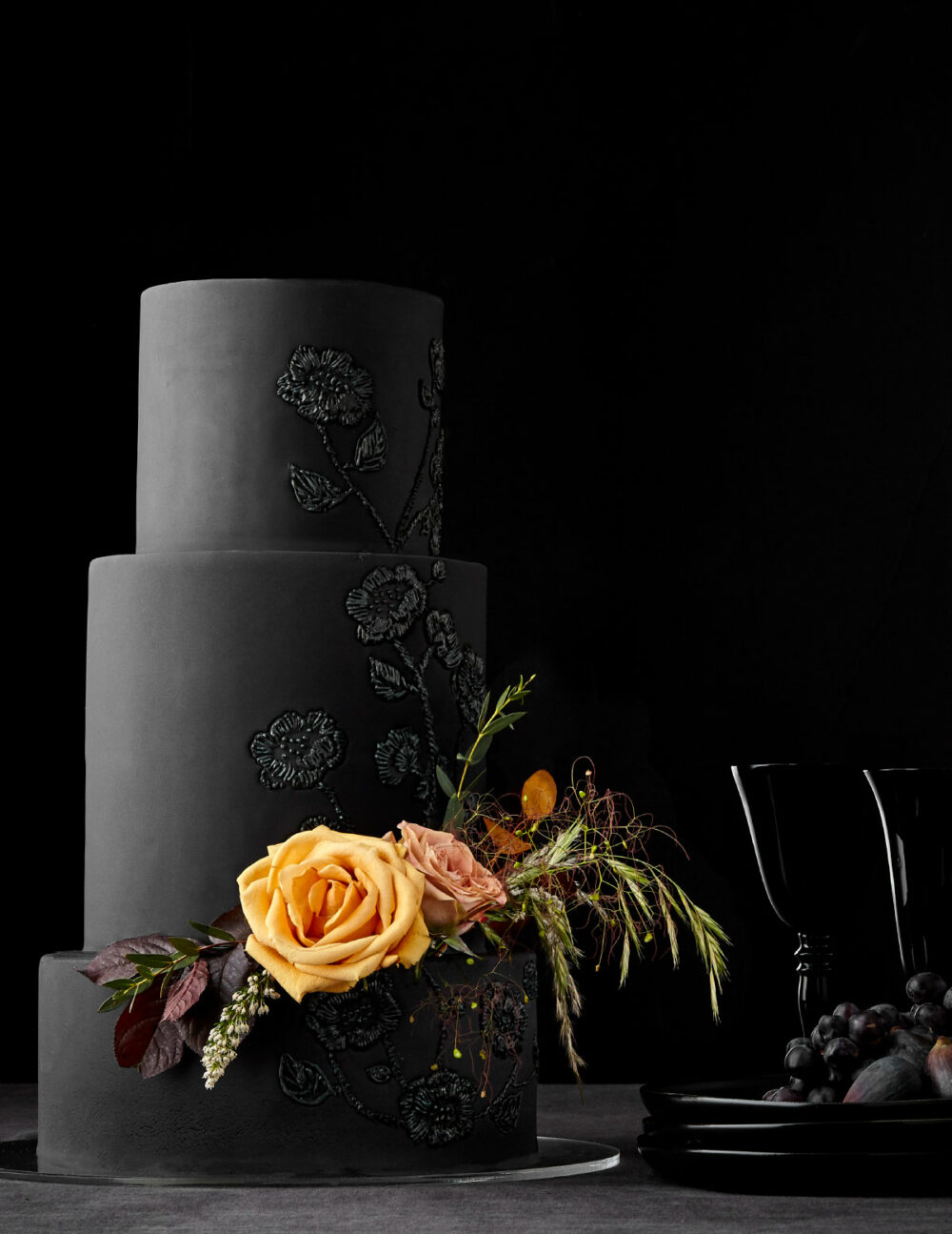 So rather than push it into saccharine territory, why not give it some edge in an unexpected color scheme? This modern, three-tiered beauty by Oak Cliff confectioner CRUMB & KETTLE features tonal, embroidery-style floral details and living blooms by DIRT Flowers. It’s a wedding treat that strikes the perfect balance between sweet and spice.