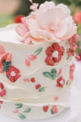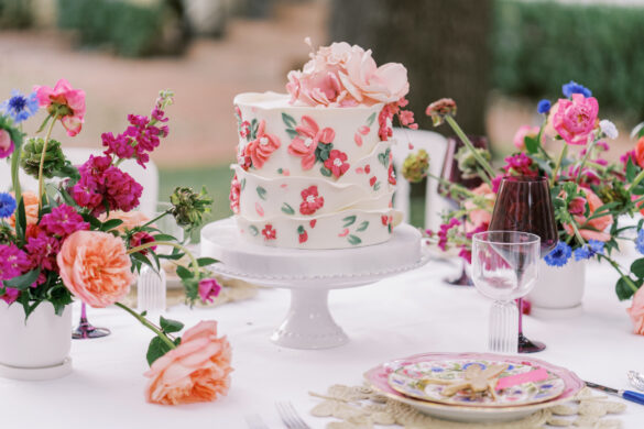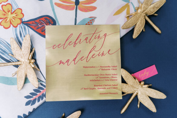 Corinne and Taylor’s combined table was built around a bright patterned place setting from Blue Print, accented with modern glassware and festive florals. Haute Floral provided flowers in all different shades of pink accented with a bold pop of blue to draw in the place setting. They carried the Garden Party theme through to this tablescape by using woven dragonfly placements and a dragonfly place setting that Stamped Paper Company provided. The cherry on top of this table is the spring-themed cake from Fancy Cakes by Lauren!