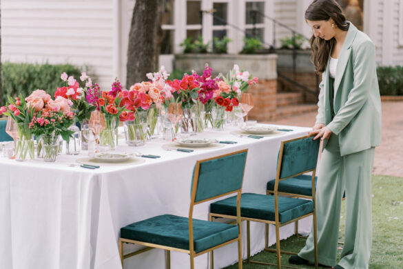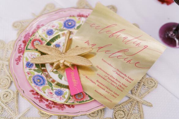 Taylor’s table is chic and modern with bold pops of color and monobloom arrangements. Once she saw the dragonfly plate, she knew that would be the star of the table! Using that plate as a jumping-off point, Taylor created a green and pink scheme that is equal parts girly and clean. Taylor wanted to incorporate green as much as she could, but not in an overbearing way. The Sabre Icone flatware from Blue Print and Emerald Mila chair from Posh Couture were the perfect additions to her table. The best compliment to a scheme with bold colors adds some dimension and texture which is why the woven placemat from Blue Print was the perfect addition to this table!