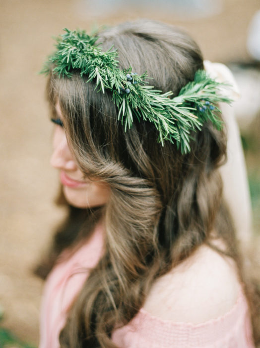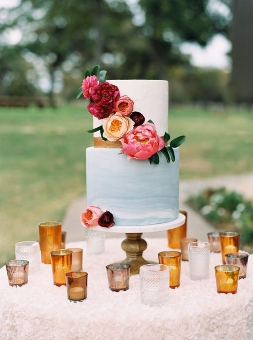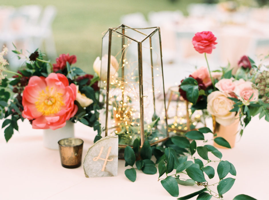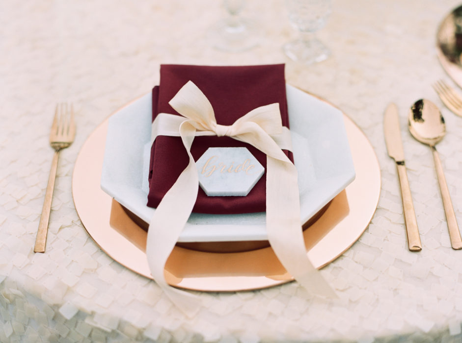 Wendy also brought in elements of marble and copper to accent the rosy tones: marble cheese boards and copper tasting cups donned the cheese-and-cider tasting table; hexagonal marble tiles served as the escort cards; marble-footed vases displayed the arrangements; and copper-colored votives surrounded the cake.