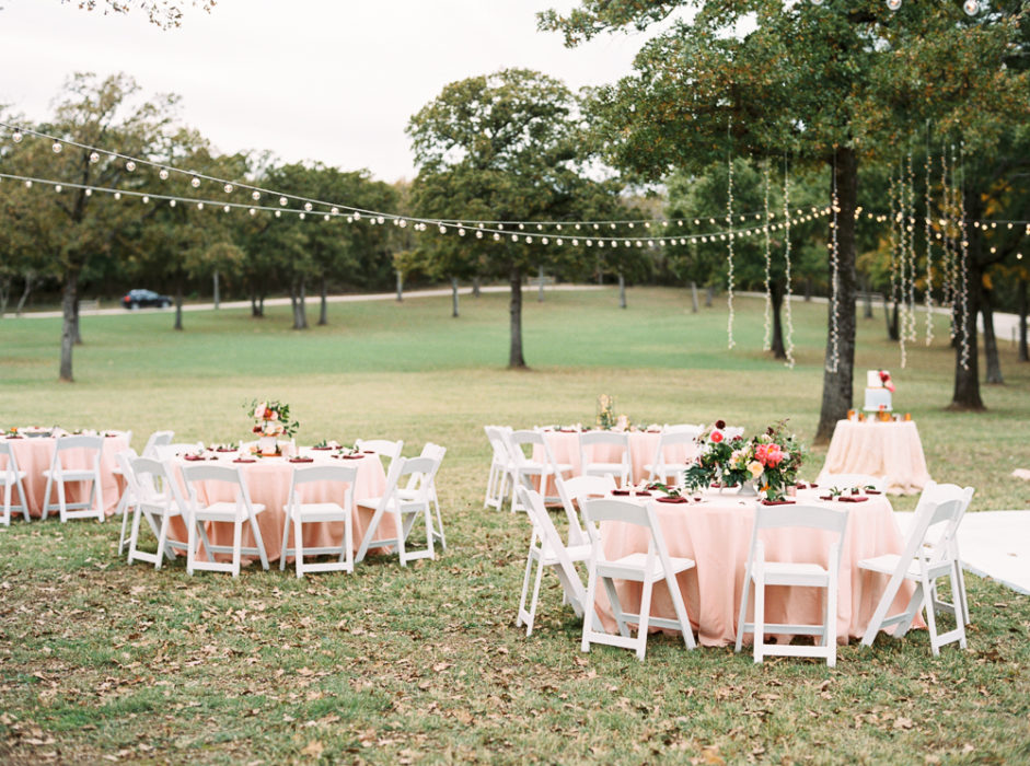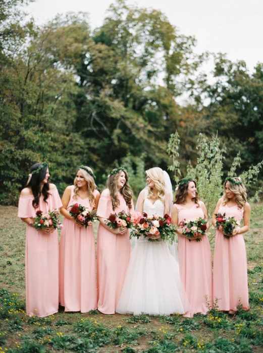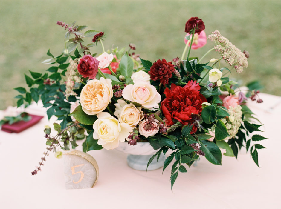 Wendy’s starting point was Cassie’s love for the color pink, but she needed a contrasting hue to make the arrangements pop. She met with Maxine Owens of The Southern Table, and the pair chose a warm burgundy shade that added depth and interest to the flowers and decor.