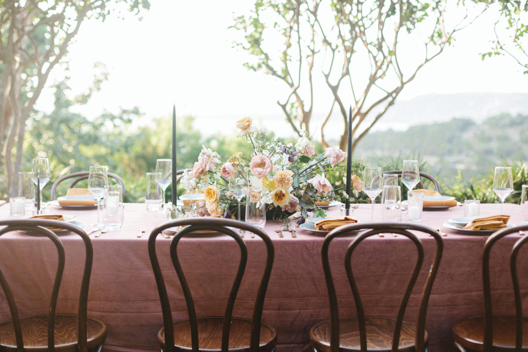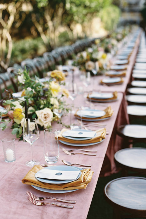 Having seen almost every trend in the wedding industry, Charla suffered from a bit of decision paralysis. Instead of fretting over the details, she looked to her trusted friends—Wendy Kay from Birds of a Feather Events and Maxine Owens, owner of Max Owens Design—to help her plan and design the big day. Charla chose her colors (blue, ochre, and blush) and helped with some paper decisions. “I wanted it to feel like Thanksgiving,” Charla says. “I wanted people to pass food vessels and talk. I literally stepped away and just showed up.”