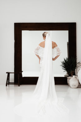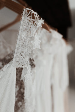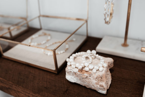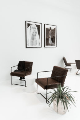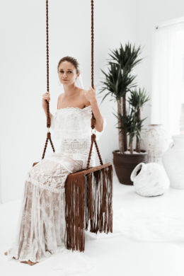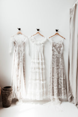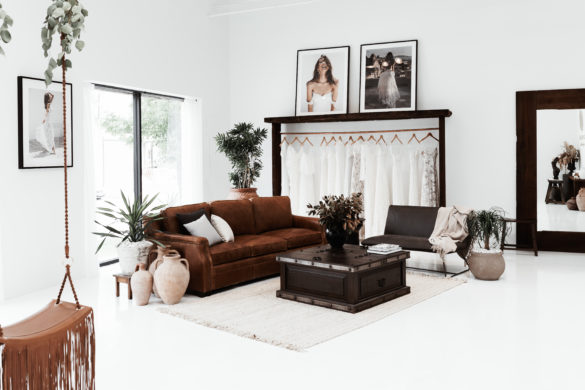 Pristine white walls and floors juxtapose dark wood and deeply colored decor to create a trendy aesthetic at the new Grace Love Lace showroom in the Design District. With racks of gowns covering the walls, the spacious interior gives brides the space to play as they try on their options. Wooden shelves are decorated with delicate jewelry and accessories, and large windows at the front let in sunlight, causing the entire space to glow. Other features, like a swing, set the mood and mimic the lighthearted nature of Grace Loves Lace with its chic but comfortable dresses.