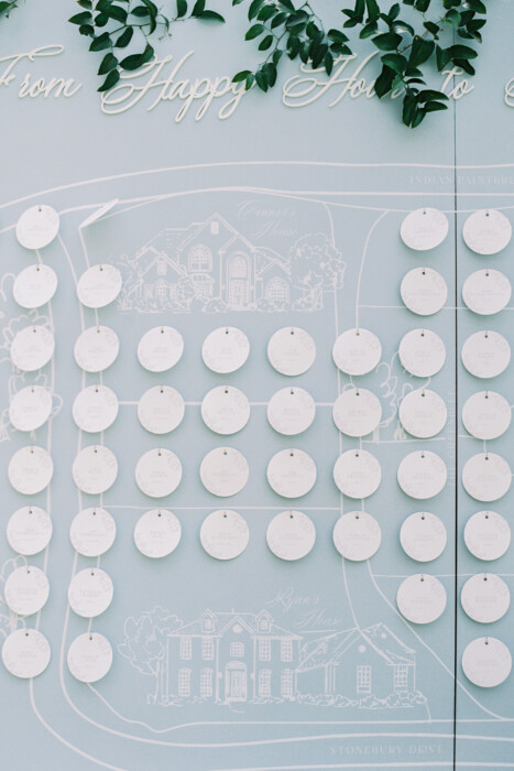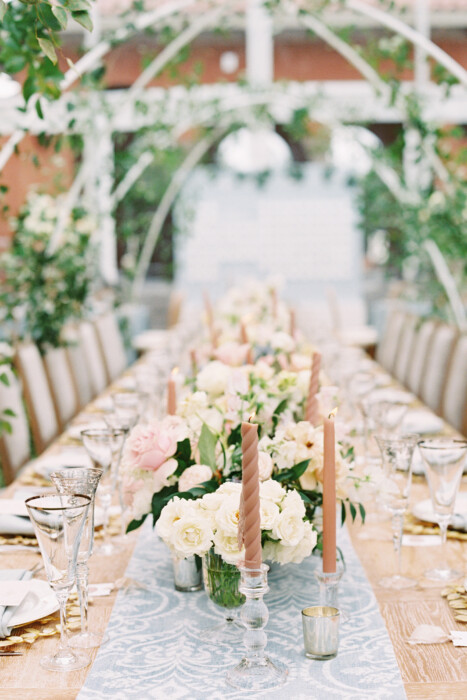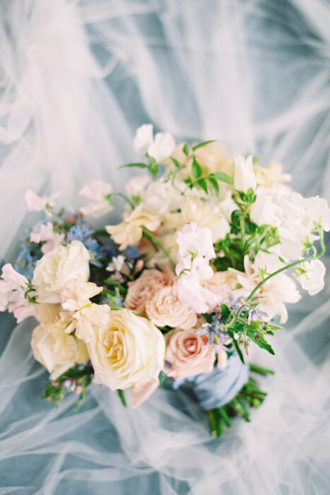 Family and community were central influences on the finer details of the day, including Ryan’s bridal bouquet. An embroidered handkerchief made from her grandmother’s wedding gown served as Ryan’s “something old.” She carried it down the aisle wrapped around the bouquet along with her “something borrowed,” her father’s old wedding ring.