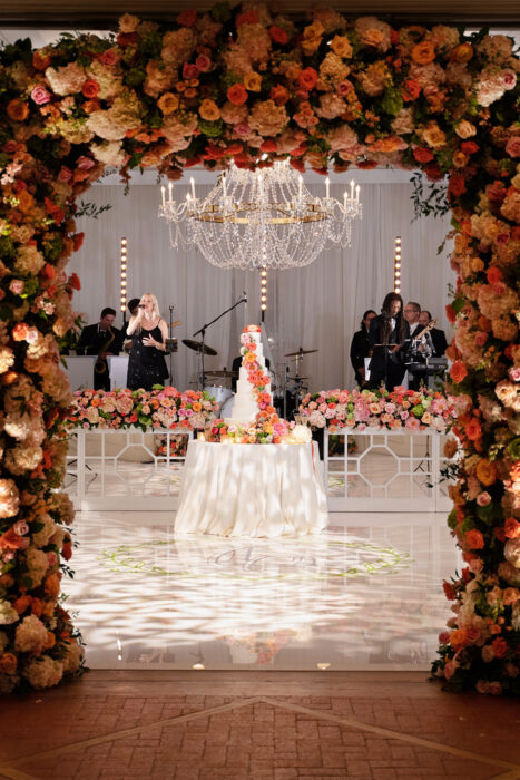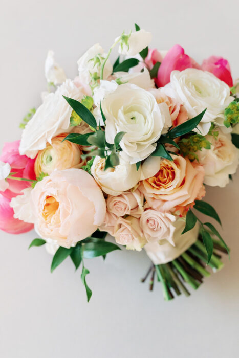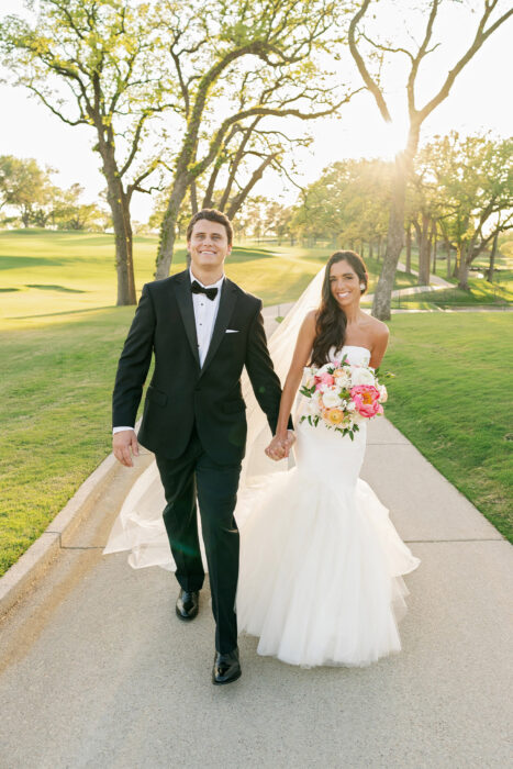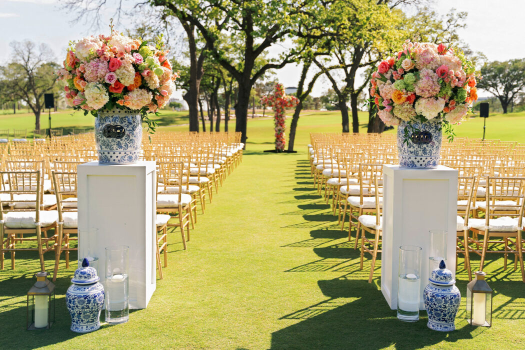 Many couples might feel alarmed at the thought of last-minute surprises. But when the location of Christina Kelly and Lane Hamilton’s spring ceremony changed just two days before the wedding, the couple adapted beautifully. What was intended to be an indoor church ceremony quickly pivoted, due to fluctuating COVID policies, to an outdoor “I do” on their reception venue’s golf course, complete with reconfigured design elements to complement the new location. Overall, the choice suited the bride’s initial vision for her day. “I just wanted it to be colorful and happy,” she says.