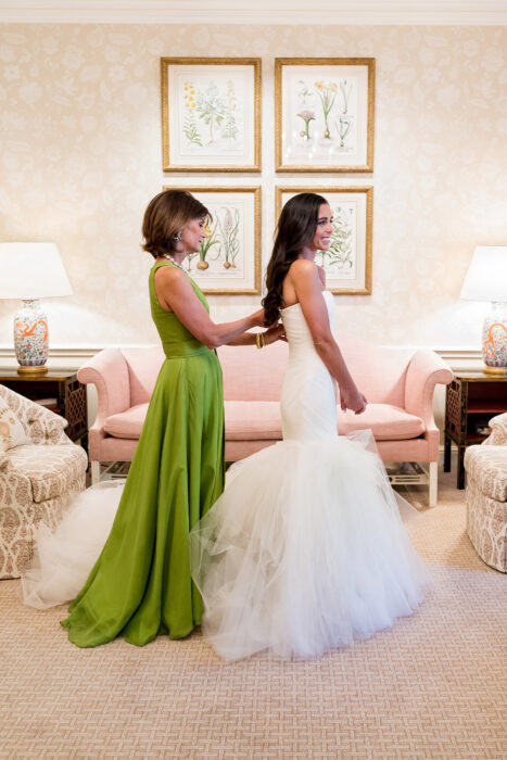 Christina imagined she’d pick a simple silhouette, but when she tried on this Vera Wang gown, she knew it was the one. “I didn’t think I’d have that moment,” she remembers, “but I did.”