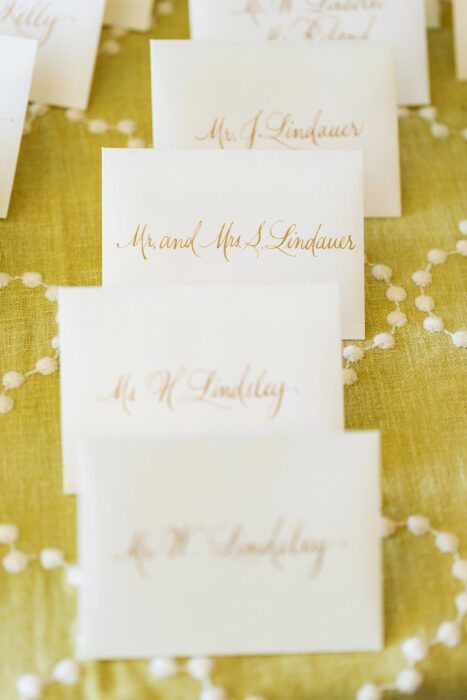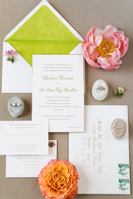 “Christina wanted to be different—she loved bold, bright, happy colors,” says planner Kirstin Godat of Kirstin Rose. “She loves the color green, so we incorporated green with our save the date and other paper goods to hint at our vibrant palette.”