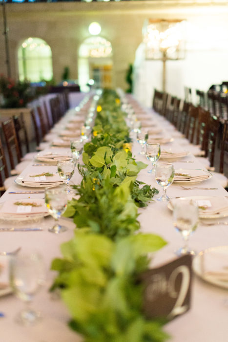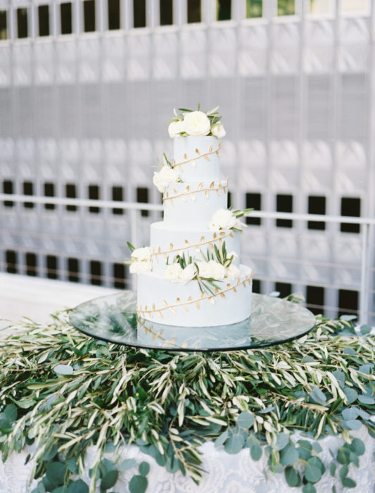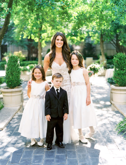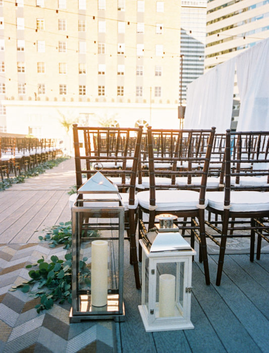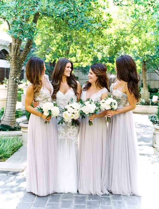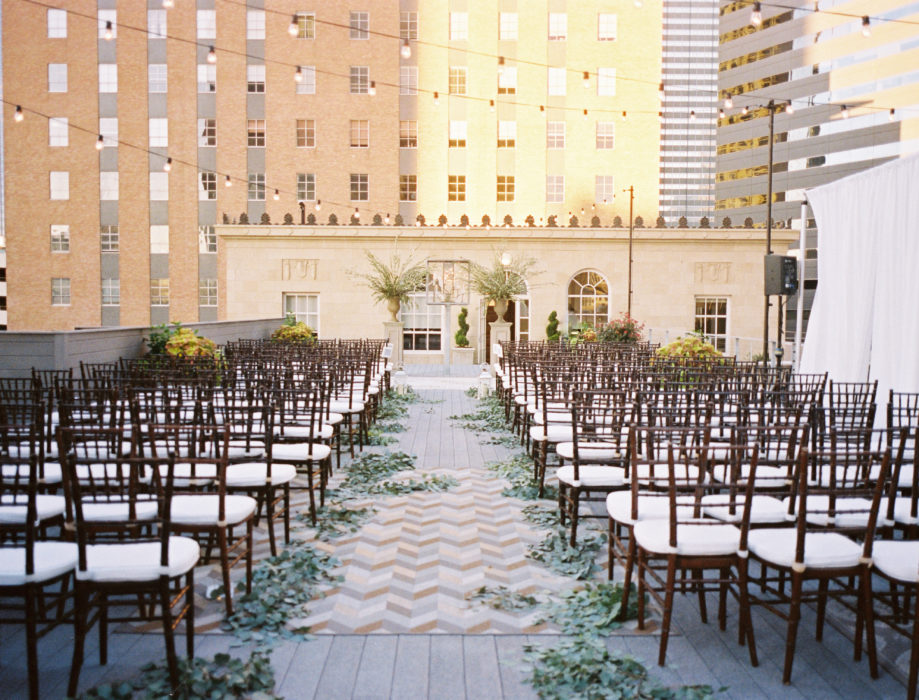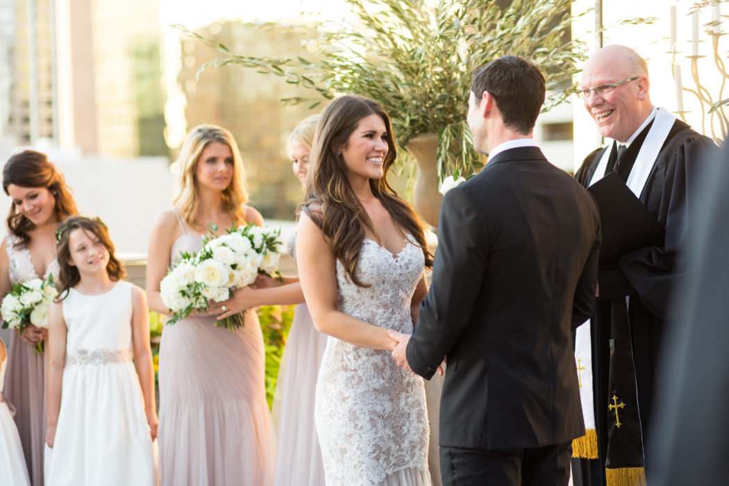 Lauren Borsheim and Dallas attorney Connor Sheehan met the old-fashioned way: through mutual friends. Four years later, a birthday trip to Costa Rica ended with a proposal. When it was time to choose a venue for their wedding on September 12, 2015, their love for the outdoors led them to a rooftop. Understated decor in neutrals with white hydrangeas and green, leafy runners let the city shine: “When you’re surrounded by the Dallas skyline, there isn’t much more you need,” Lauren says. She wore a romantic Watters gown from Bridal Boutique to top it off.