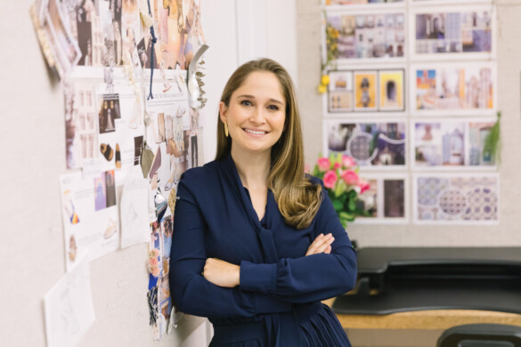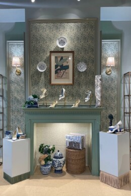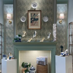 “With so many luxury stores, you go in and it’s beautiful, and it feels very rich, but it also can feel a little cold. And there’s often a guy with a suit at the door, and that can feel a little intimidating,” says Flint, who eschewed stark and slick fixtures in favor of chintz fabrics, intricate moldings and fringe trims, and designer lighting (complete with a ceiling medallion). William Morris wallpaper lines the walls, and Royal Copenhagen china hangs above a pair of mantels, which are accented with boxwood topiaries and dried hydrangea stems. Upon entering, you’re offered tea and encouraged to make yourself at home on one of the plush sofas. And though the sales associates are warm and helpful, should they ever be busy helping another customer, you’re invited to grab a size from the try-on wall along the back of the store.