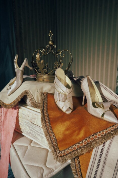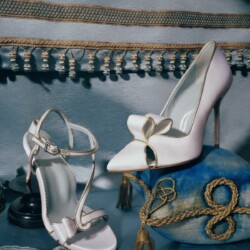 Indeed, her bridal collection includes many with grass- and gravel-friendly heels, such as the Perfect Block Sandal—available in white and gold leather, with 30, 60, or 90mm heel heights. Prefer something low? Try the Natalie flat, available in a sling or closed-back style. Or dare to wear the Perfect Pump, offered in a variety of colors and materials, in as high as a 100mm stiletto. (Interestingly, Flint notes, heels have once again surpassed flats in sales, something she wasn’t sure she’d ever seen again following the Covid-led shift toward remote working.) Many of the white styles include a blue instep—the perfect touch of something blue.