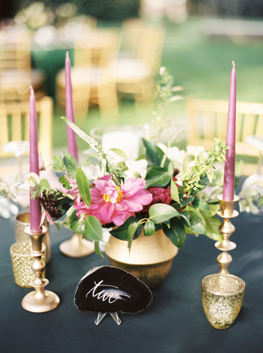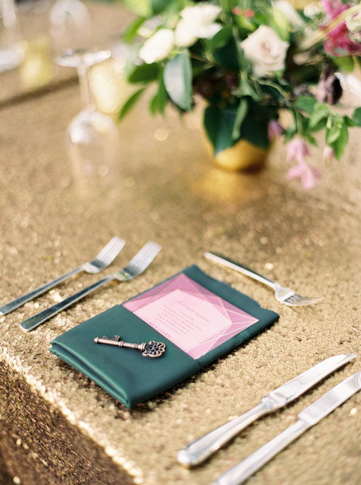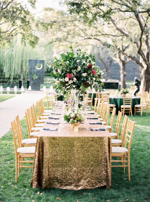 Wendy blended organic with glitz for the March 26, 2016 nuptials. Lush florals from The Southern Table and agate stone details from The Hollow Geode accentuated the beauty of the Nasher’s grounds, while gold-sequined table linens and cakes by Sugar Bee Sweets added to the glamour. But the most showstopping moment came when the bride and groom surprised their guests with a choreographed first dance to the Bee Gees’ hit “More Than a Woman.” It was a routine they had worked on for months—with help from YouTube.