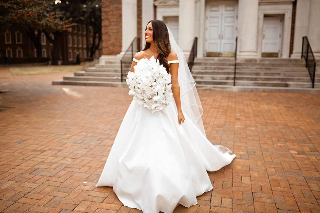 The couple gave themselves 365 days to plan their nuptials, opting for a January 2019 wedding. Diana’s grand vision for the wedding was the color white, so to get inspired, she began seeking out the most classically white element of a wedding: the dress. After trying on multiple options—and with the help of her mother, mother-in-law, and a few of her bridesmaids—Diana settled on a romantic, off-the-shoulder gown from Bridal Boutique of Lewisville. Diana speaks for all brides when she says: “I still wish there was another occasion I could wear it!”