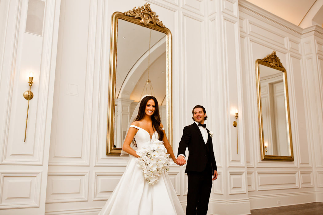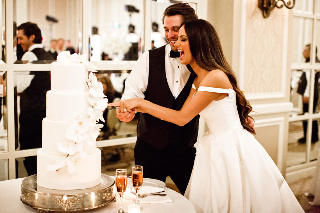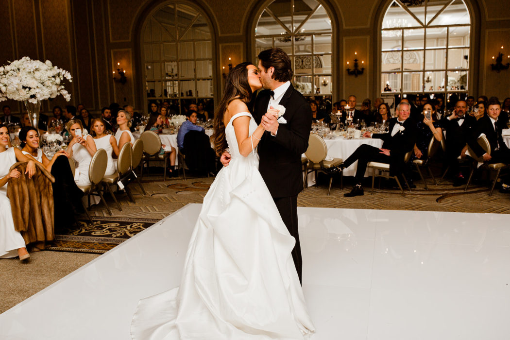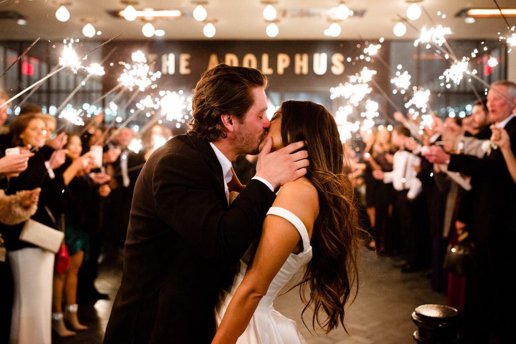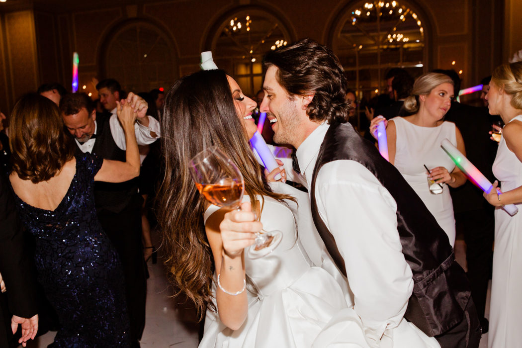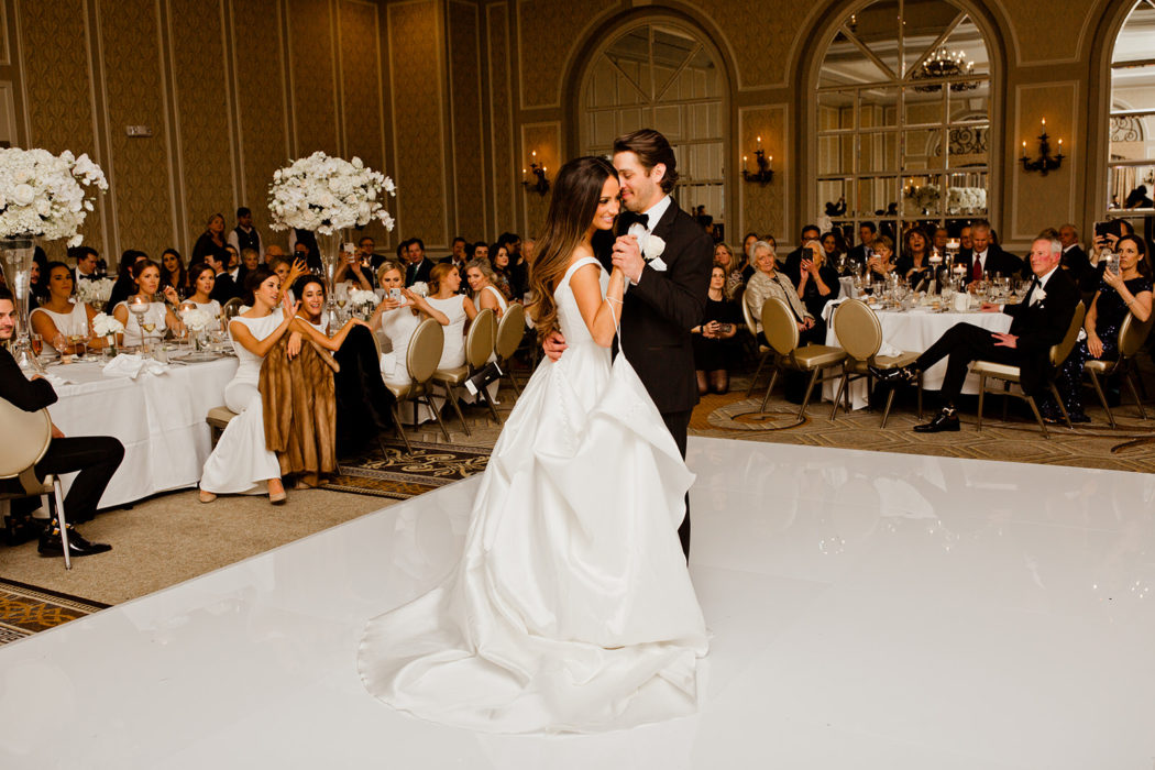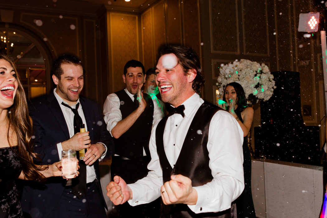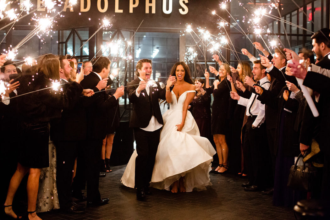 The dreamy Adolphus Hotel also hosted Matt and Diana’s joyous reception. After the newlyweds’ first dance to Elvis’ classic, “Can’t Help Falling in Love,” guests took to dancing with drinks in hand. Thirty minutes before the bride and groom’s exit, a hidden snow machine pumped a glistening snowfall over the dance floor, completing Diana’s wish for a whimsical, white wedding.