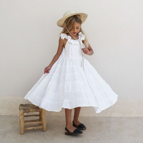 “I love combining boho details with traditional cuts and patterns. Perfect for whirling and twirling, these options are all soft to the touch, easy to clean, allow kids to move comfortably, and bring just the right amount of whimsy,” says Adilova. “Adding hair accessories like felt bows to your flower girl’s look can be a nice way to dress up or down their hairstyle.”