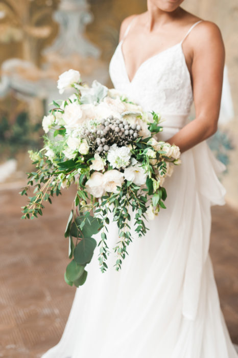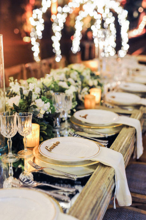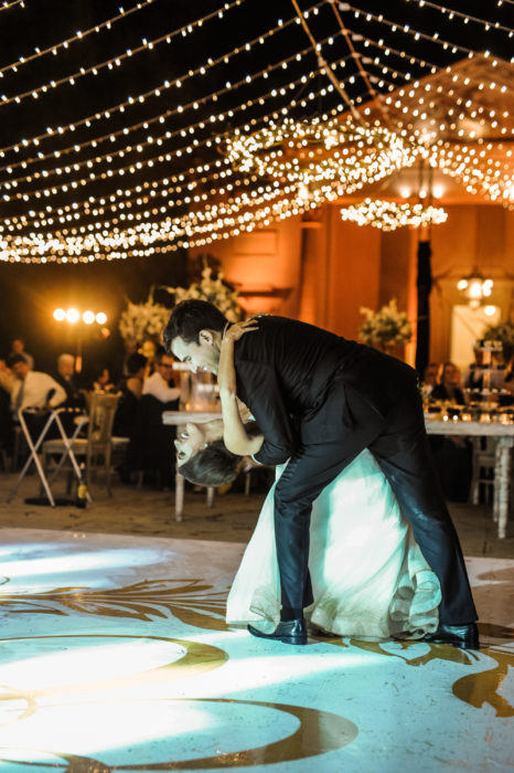 Vows were exchanged at the Greco-Roman church on the estate. The ceremony blended old and new: a quartet played Pachebel’s “Canon in D Major” as Emily processed down the aisle, but “Don’t Stop Believing” was also in the mix. Members of the bride’s family read a Catholic prayer. The couple implemented the Mexican lasso tradition, where both sets of parents came up to the altar and prayed for the couple while placing a floral lasso around them.