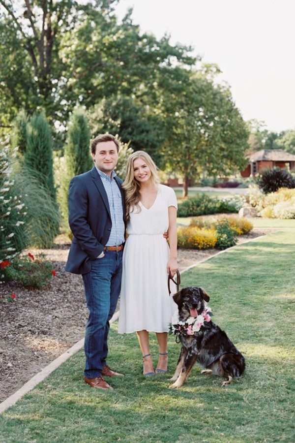 Six years later, the two were beginning a new chapter of their lives back in Texas. Austin was considering the University of Oklahoma for law school, so he and Lauren planned a weekend trip to their old stomping grounds. Before dropping their pup off with Austin’s parents for the weekend, they took Honey out for a walk around their neighborhood. To Lauren’s complete surprise, Austin got down on one knee and asked her to marry him! They celebrated the big moment with both sets of parents—who oddly enough live on the same street. The two continued their festivities in Norman, even making a stop at the dive bar where the spark began.