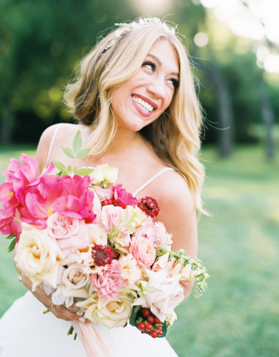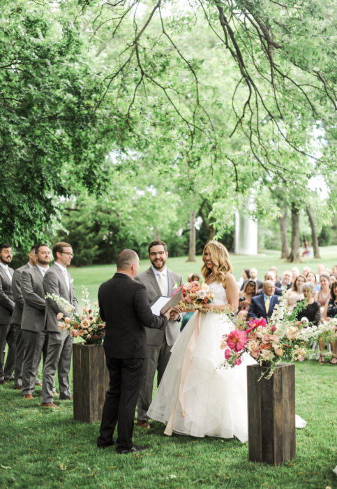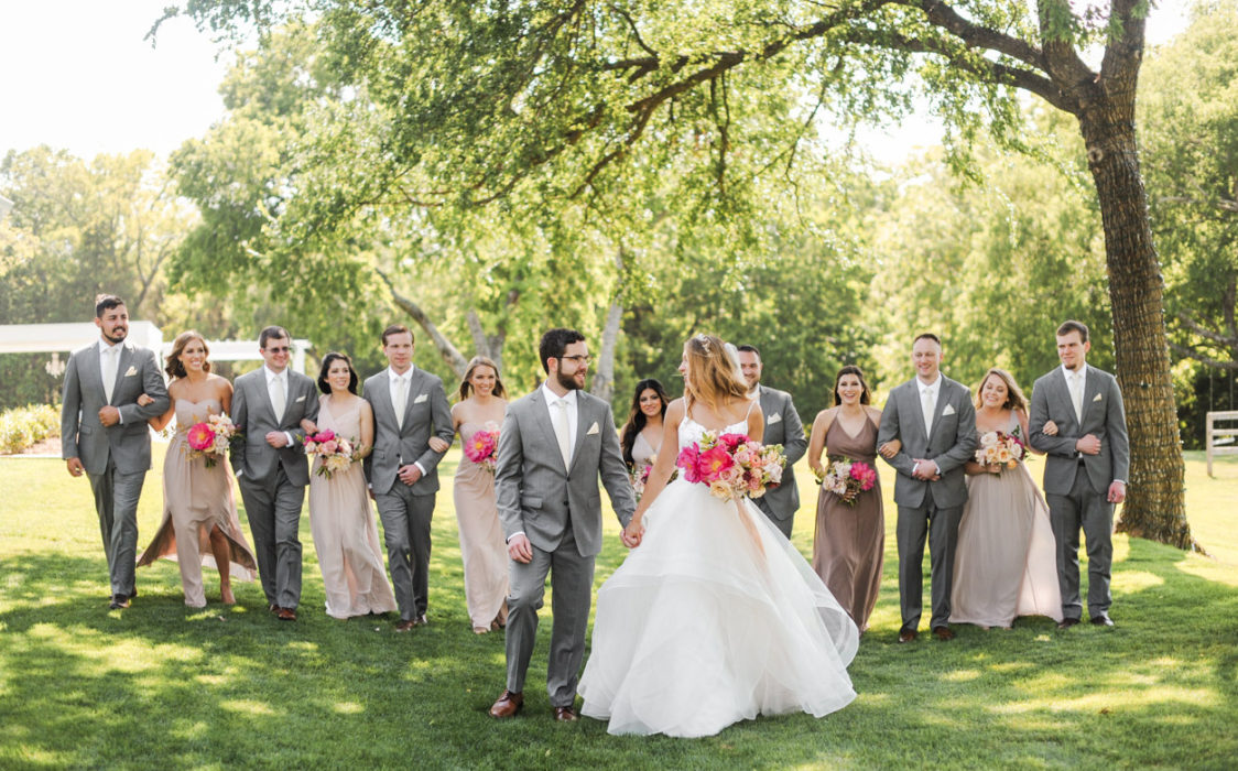 For their wedding, Lauren and Matt wanted simple elegance. They both love nature and spending time outdoors, so the Firefly Gardens were a perfect choice. The couple entrusted Lottie Fowler from Grit & Gold with achieving their organic-yet-elegant vision. The bridal party wore neutral tones to match their natural aesthetic, which was also emulated in the pink peony floral arrangements. And as an extra touch, guests were given intricately carved wooden foldable fans for the outdoor service.