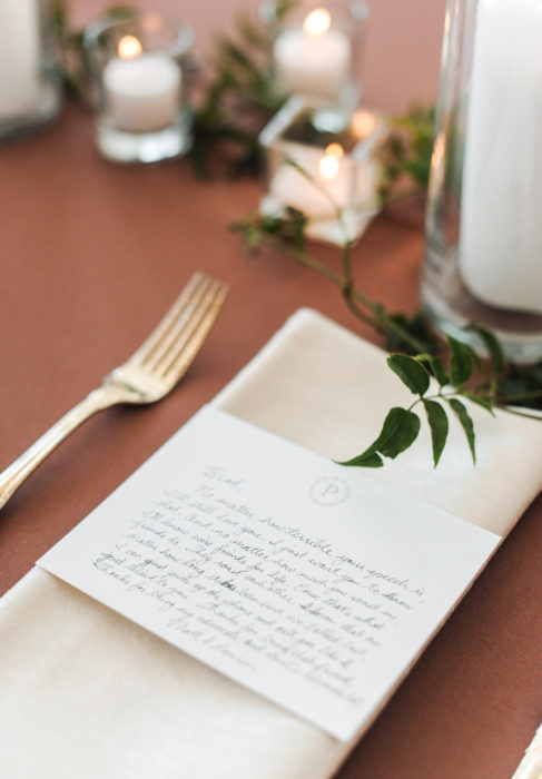 In place of escort cards, the couple left personal notes they had written in each guest’s seat. Our intention was to show how grateful we are for them and the memories we have with them,” she says. “It was fun to reflect on the role each guest has played in our individual lives and our relationship.”