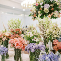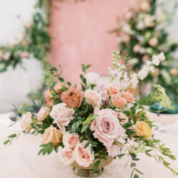2. Big flowers second. Go in next with your larger, statement blooms, (think: peonies, garden roses, ranunculus, etc.) and evenly space them out to be seen from each side of the arrangement. “You also want to remember that table arrangements are seen from the top and at eye level,” says Taylor. “So, keep in mind all angles when arranging.”