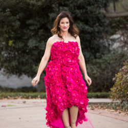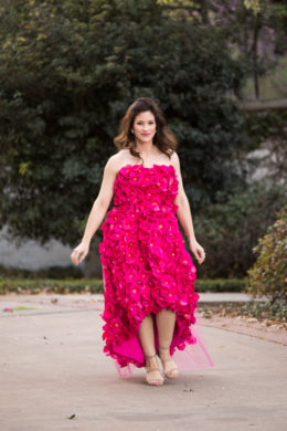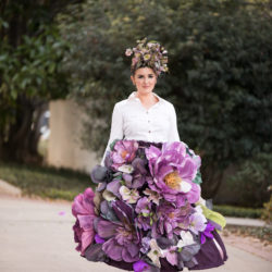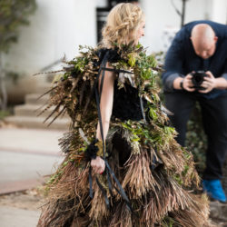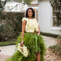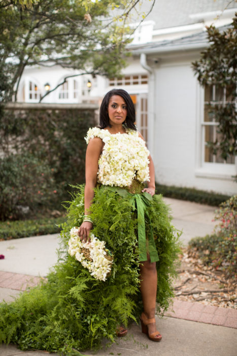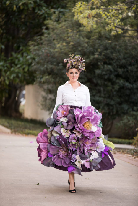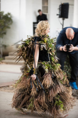 GRO Designs modeled by Caylin Godfrey. Inspired by Marie Antoinette and "The Hunger Games," and constructed from the bottom half of a fake Christmas tree.