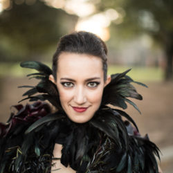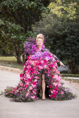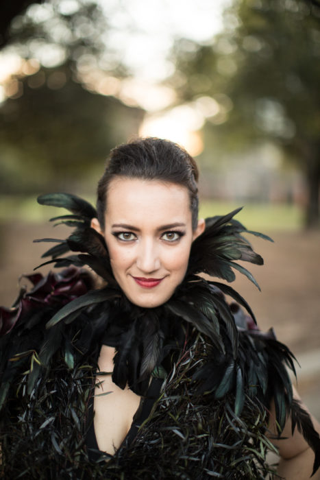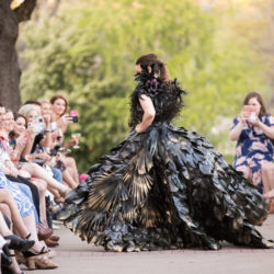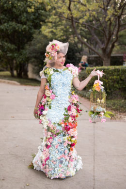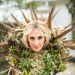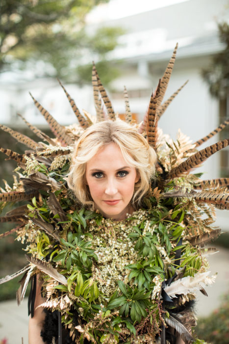 Kirstin Mullen models The Garden Gate. Mullen carried two live birds from Garden Gate's studio.