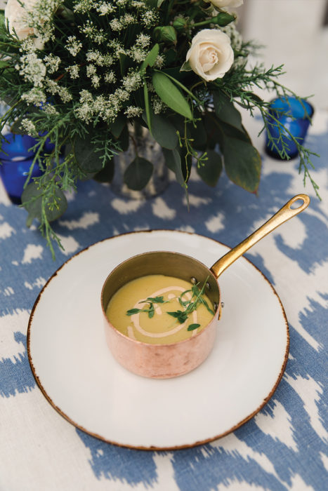 Isabel and her sister would escape the ski slopes to Beano’s for chilled Moscow mules. To highlight this fond memory, the individual summer vegetable bisque soups were served in copper bowls, mimicking the duo’s staple drink.