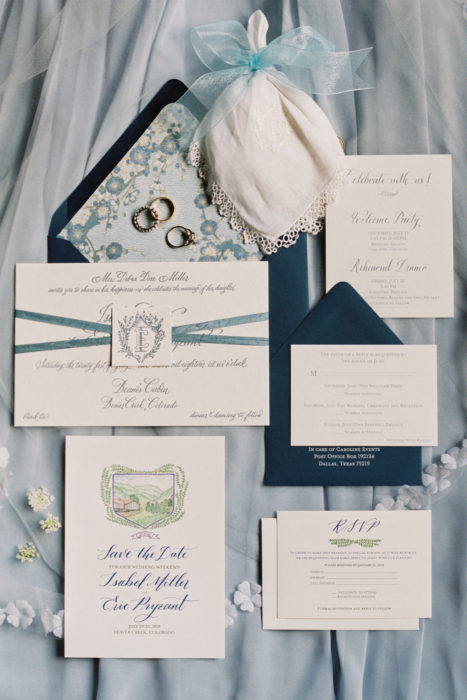 Isabel’s mother designed the watercolor on the save the dates to reflect the mountainous scenery at Beano’s Cabin. “It was very special to integrate her work into the wedding,” Isabel says.