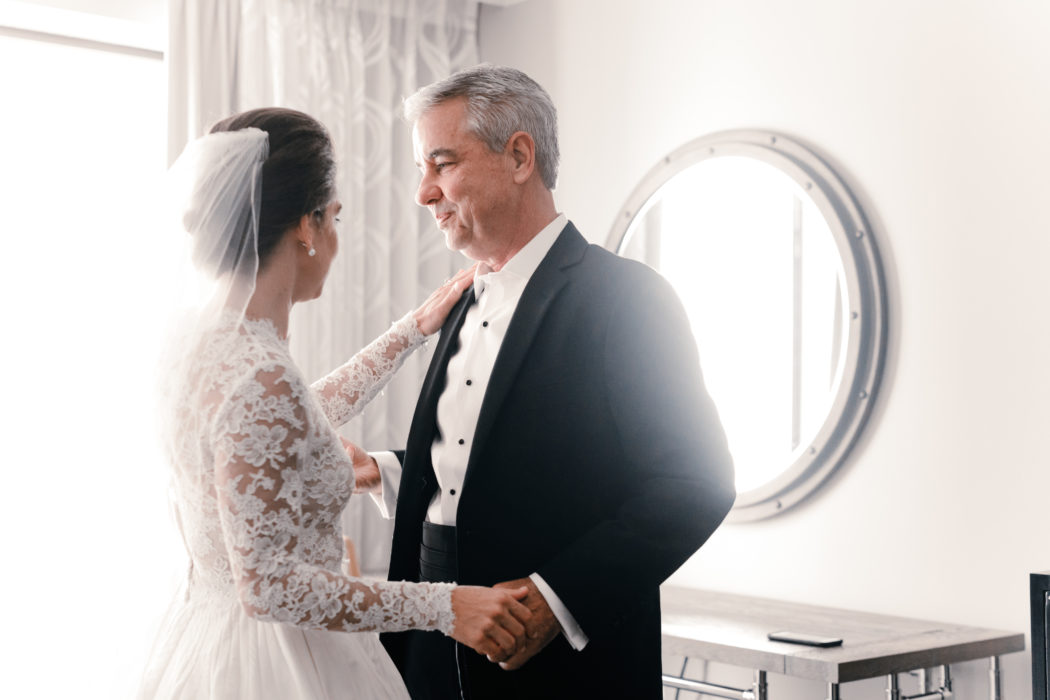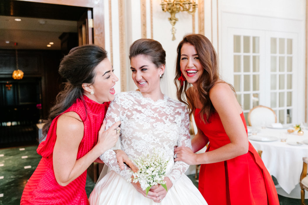 Having been to more than 20 weddings in the past few years, Margaret and Brian decided to handle their bridal party a little differently. Instead of the traditional line-up of friends, Brian’s best friend, stepfather, and Margaret’s two sisters (who wore red) were the only ones chosen to stand beside them. They rented a cabana at the hotel’s rooftop pool for their close friends to enjoy the day of the wedding and served champagne before the ceremony that guests could take in with them.