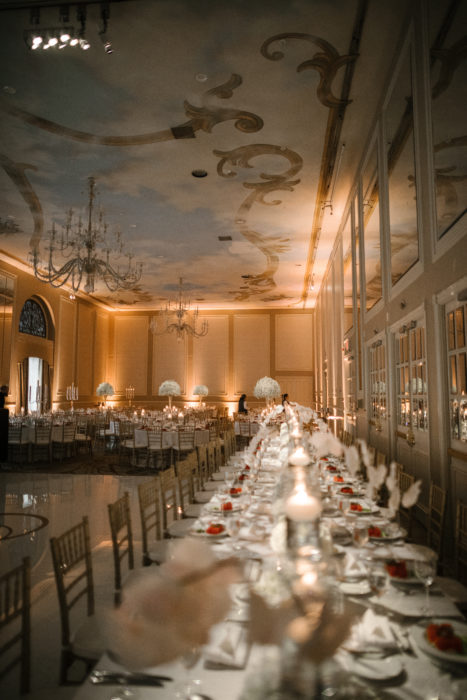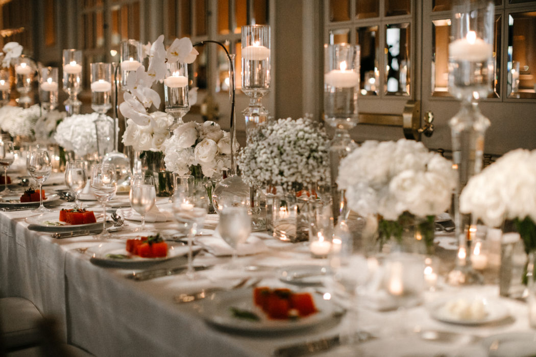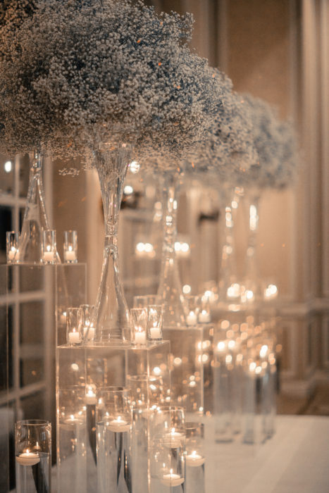 She wanted her wedding to look timeless, and the Adolphus’ interiors perfectly captured that vision. The decor was all white and gold: baby’s breath flower arrangements, candles everywhere, and a white dance floor with a golden “S” in the center.