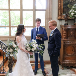 This simple ceremony in the foyer of the groom Brian's family home created a deeply personal moment that can be shared with the people they love in a space that's special to the couple.