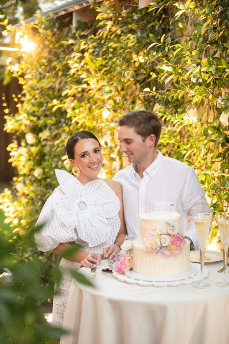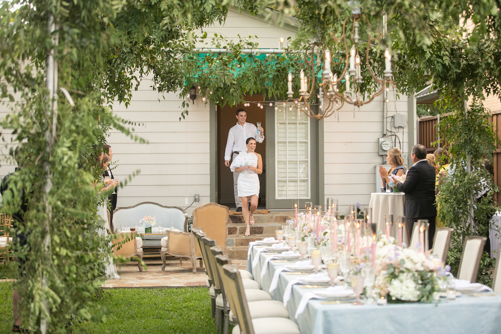 Having an at-home reception can allow for a more casual vibe, creating opportunities for the couple to really show off their personality and style. In this case, bride Katherine chose to change into a short and stylish dress that helped her match the at-home vibe.