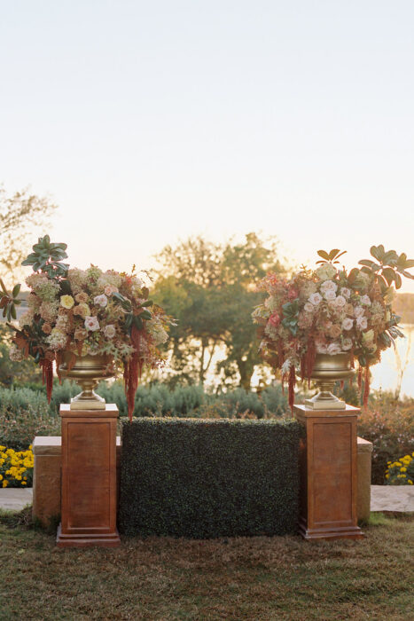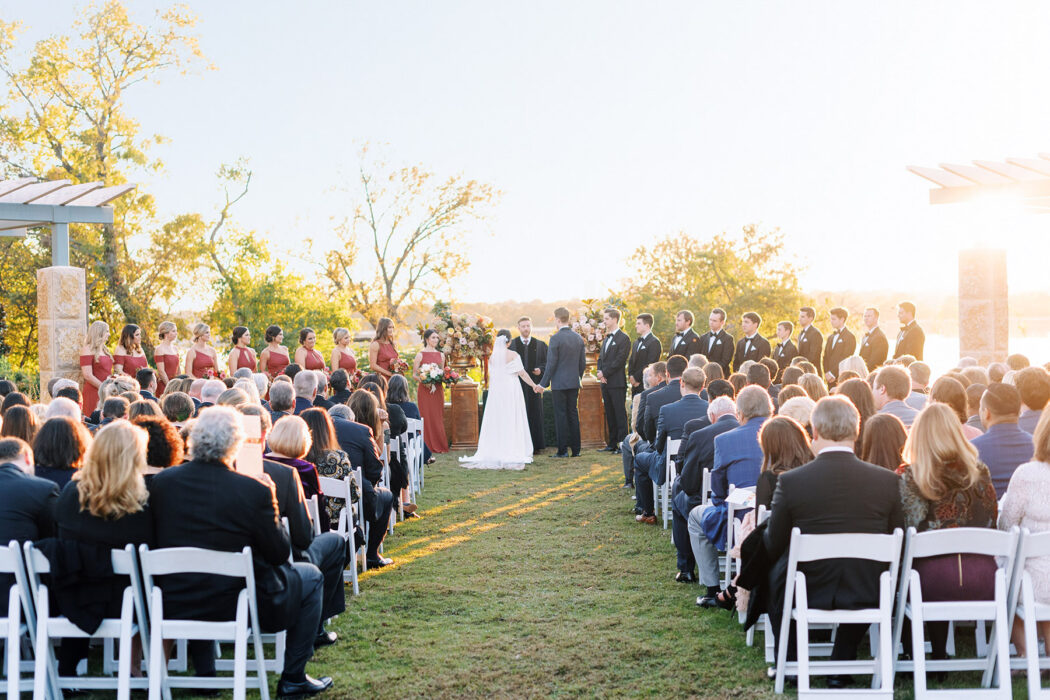 Five years prior to their autumn ceremony, Gina Priolo and Colin Peterson met at a party at the University of Texas. “It was the second semester of our senior year, so we almost missed each other,” Gina jokes. Thank goodness they didn’t, as the two dated following their graduation, despite Colin traveling around the country for work. After years of courtship over long distance, they gathered together with friends and family and exchanged vows overlooking White Rock Lake on October 26, 2019. “It was pretty picture-perfect, that’s for sure,” the bride reminisces.