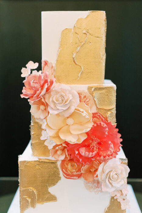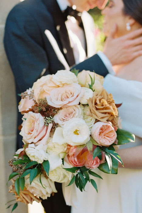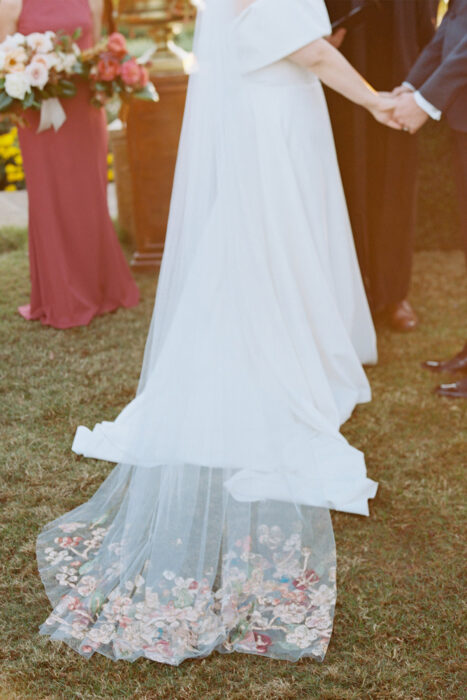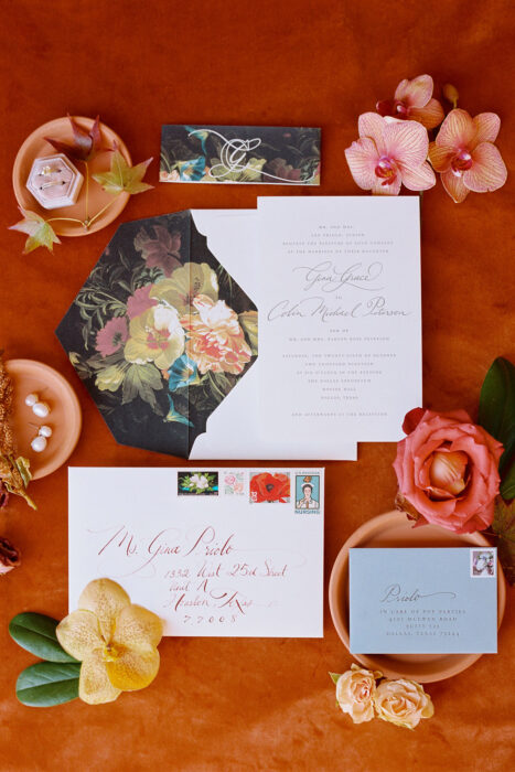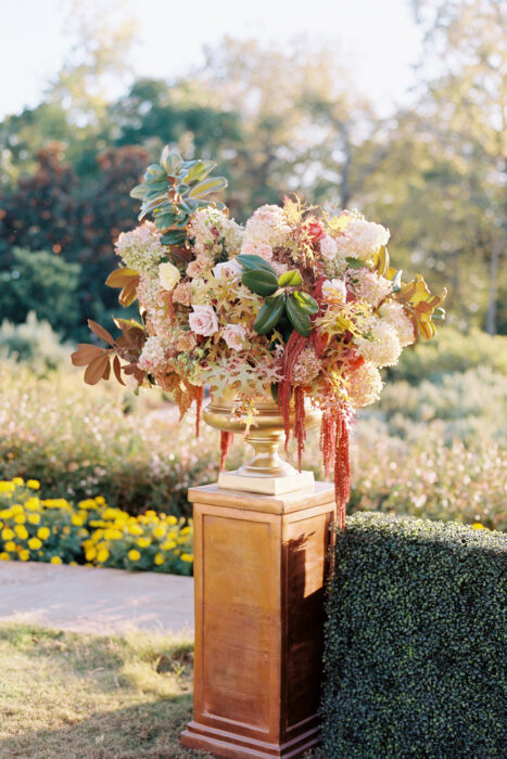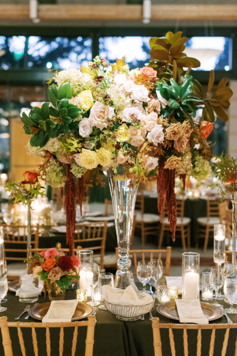 A Seasonal CelebrationPlanning a fall wedding? Why not let Mother Nature dictate your color scheme? Eschewing the classic all-white wedding, Gina wanted a vibrant, autumnal affair that included deep, lush hues to echo the season. Using their invitations as inspiration, Gina incorporated moody tones and lush leaves throughout her selections, choosing mauve bridesmaid dresses and even hand-painting florals on her veil to tie into the theme. Of course, flowers played a major part in the overall aesthetic, as florist Alexa Morton of Branching Out Events blended bold blooms with fall foliage to stunning effect. “I pulled a lot of PeeGee hydrangeas, hanging amaranthus, and taupey-gold-colored roses to bring that autumnal tone in,” Alexa says. “They created a real warm, inviting palette.”