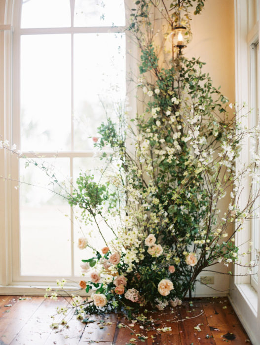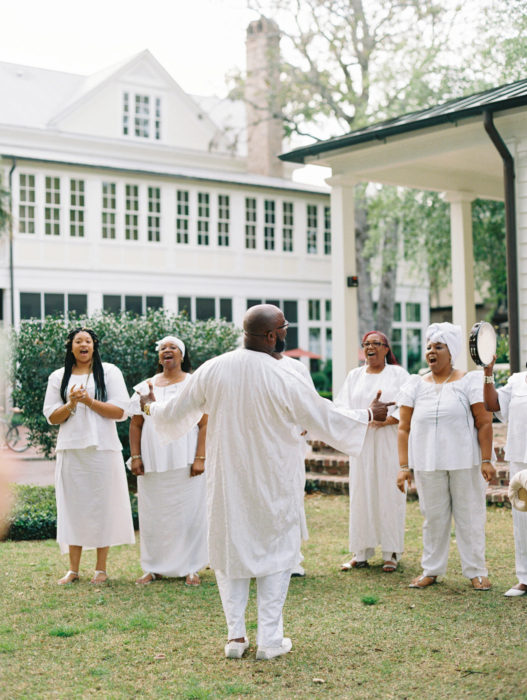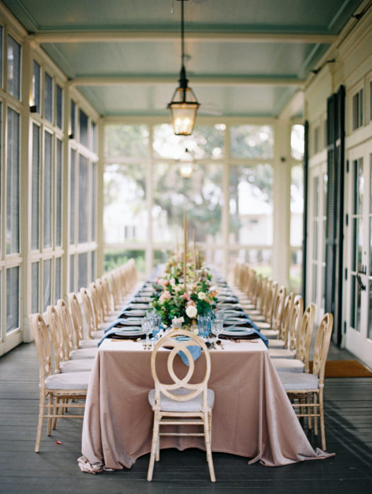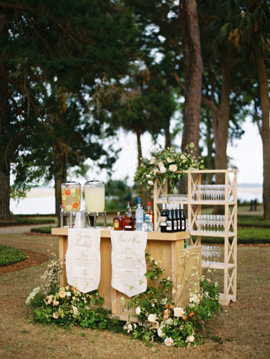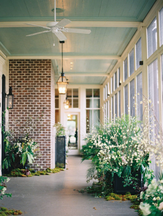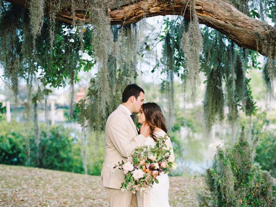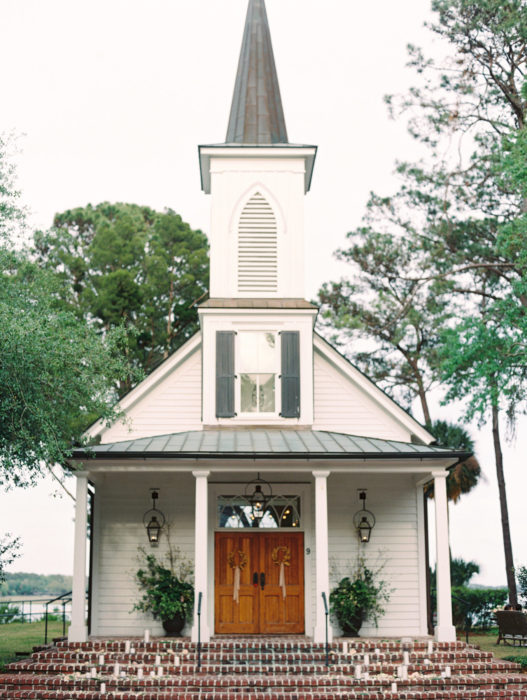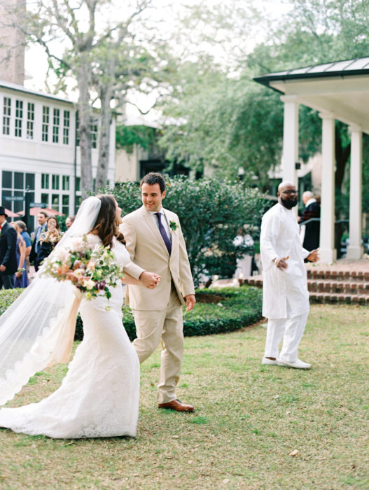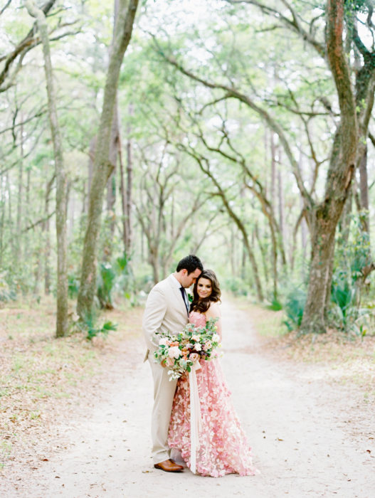 On April 12, 2017, Gina and Ryan’s 36 closest friends and family members watched them exchange vows. As they exited the chapel, a Gullah choir sang “O Happy Day”—and it truly was. Florals by The Southern Table set the scene for dinner, which was held on a candlelit, screened porch. Gina opted for a subdued Southern color scheme and a traditional Anna Maier lace dress for the ceremony. For the reception, she changed into a pink Marchesa gown that she’d found a week before the big day.