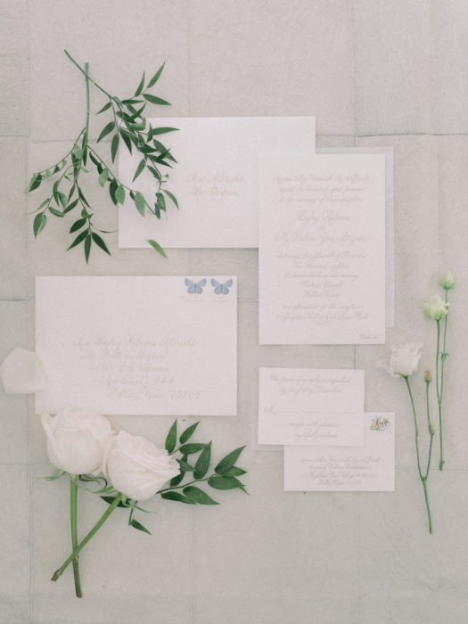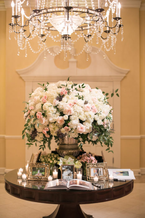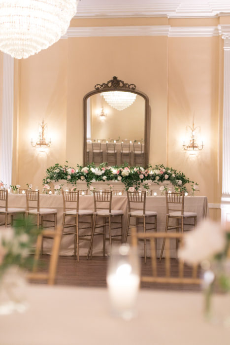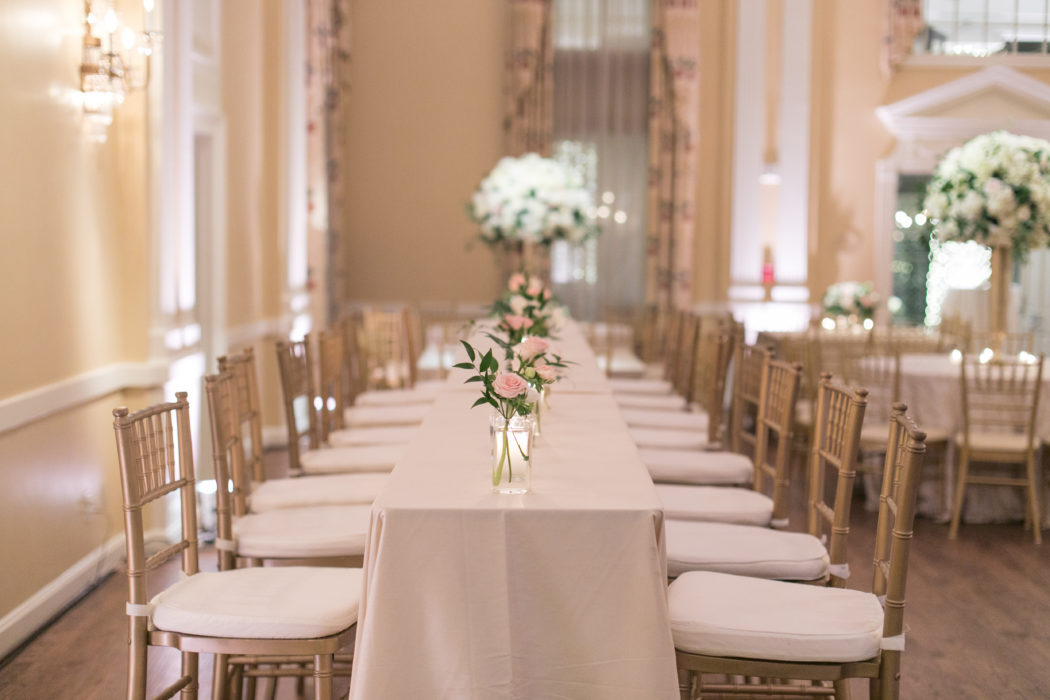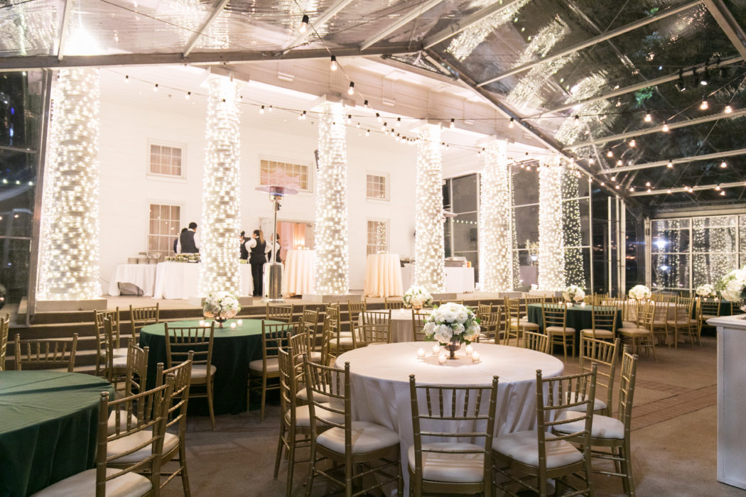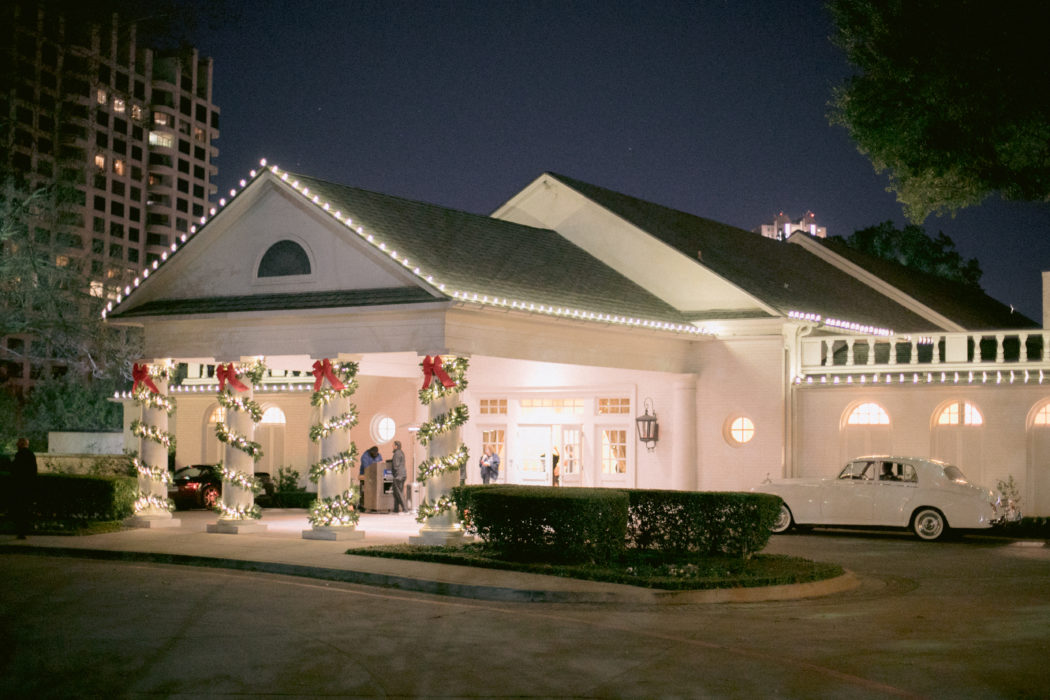 After Hayley and Dalton became The Stogners, they took their celebrations to Arlington Hall for the rest of the night. The porte-cochère, with its floor-to-ceiling paneled windows, was adorned with illuminated garland in the spirit of the season. Hayley wanted “winter elegance” and with the help of Collins Coordination, used white, green, pink, and blue decor to bring her vision to the life. The tables were covered in dark green and white linens, accompanied by gold chairs, and delicate centerpieces from Park Cities Petals.