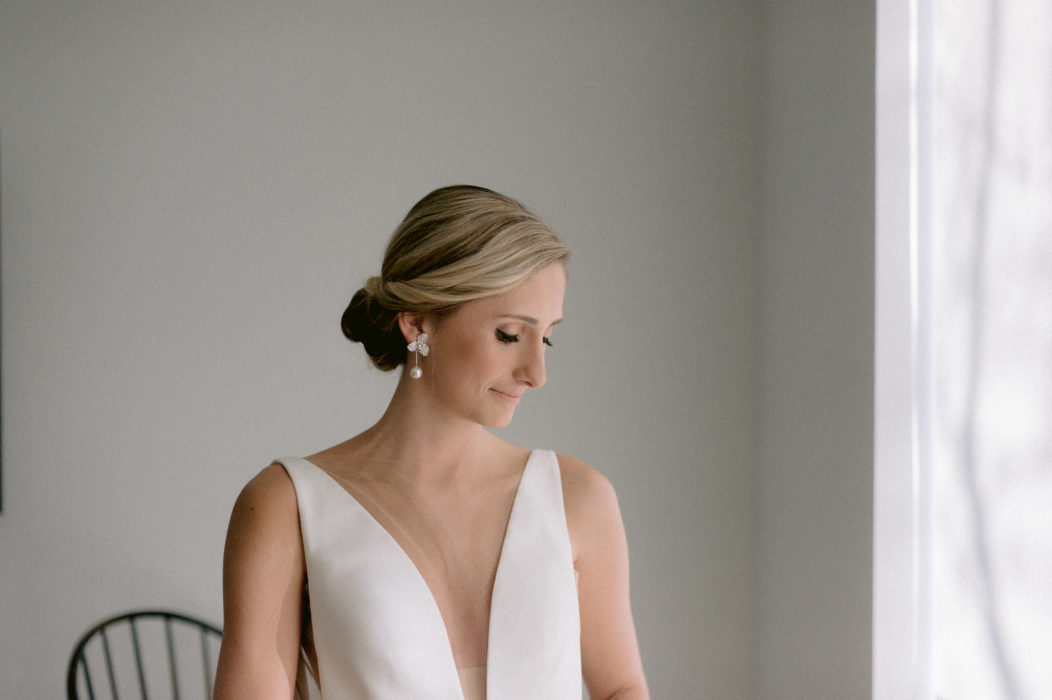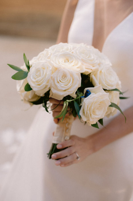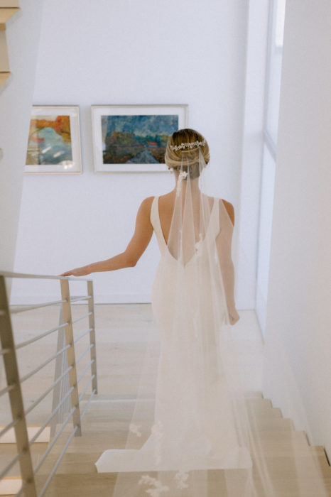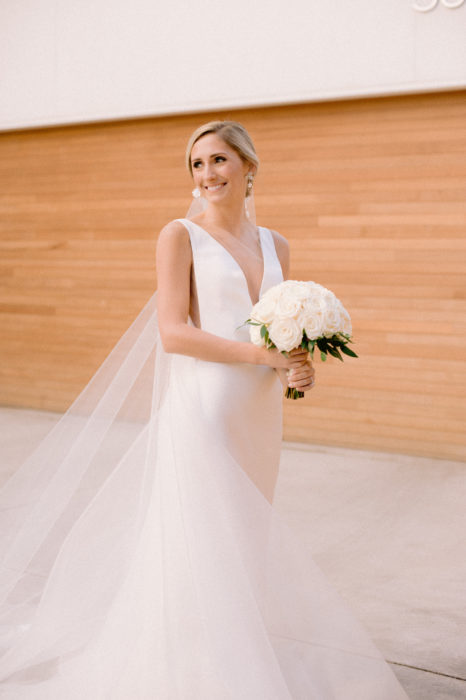 Hayley found her dream dress at her first stop, Warren Barrón. “I knew I wanted clean, elegant lines but with a little bit of drama.” Just as she’d pictured, the dress was a simple, body-fitting gown with a deep V in the front and back. Hayley complemented the dress by adding a veil, which also took the place of a train and was embellished with white floral stitching.