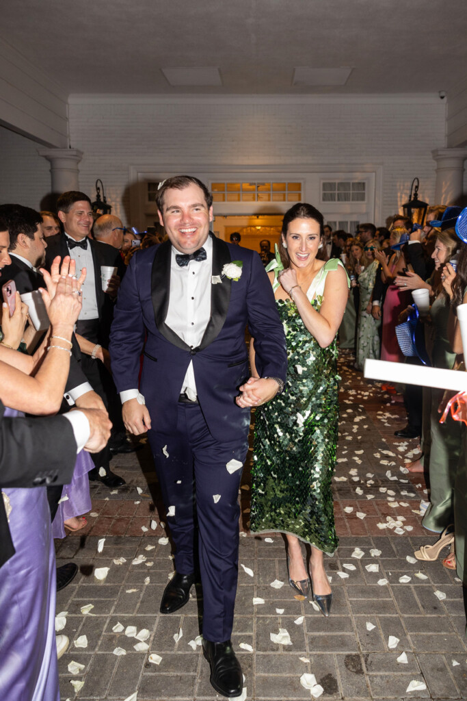 “I did not need one more white dress in my closet,” laughs Margaret Oden about her green sequined exit dress, which complemented the scheme of her wedding to Brandtley Wilson. If you, too, have a closet full of little white dresses after wearing them to your showers, engagement party, and more, consider ending the night with a pop of color instead.
