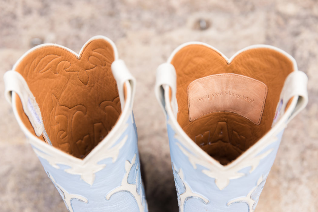 “I saw that my future initials were inlaid in leather, and I just lost it,” Molly says through tears as she retells the story. “Then the ring was tied to one of the boot pulls, and Miron Crosby allows you to put a message on the inside of the boot, and the message said, ‘Will you marry me?’ “